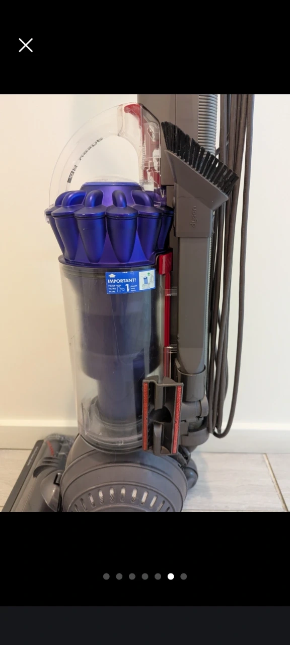 This is a Dyson Ball Animal upright vacuum cleaner. It's purple and grey. Comes with multiple cleaning attachments for various surfaces. Powerful suction for pet hair and deep cleaning!