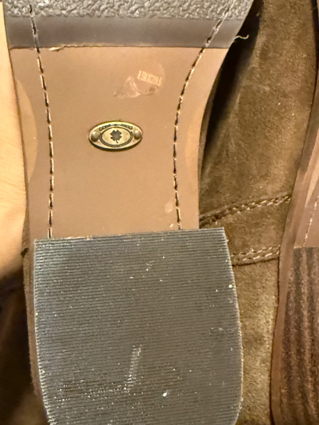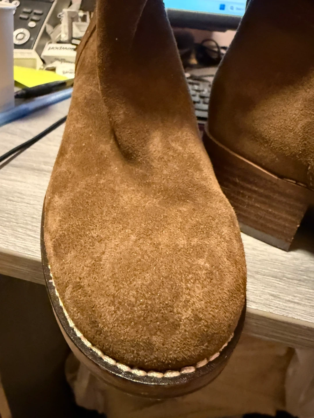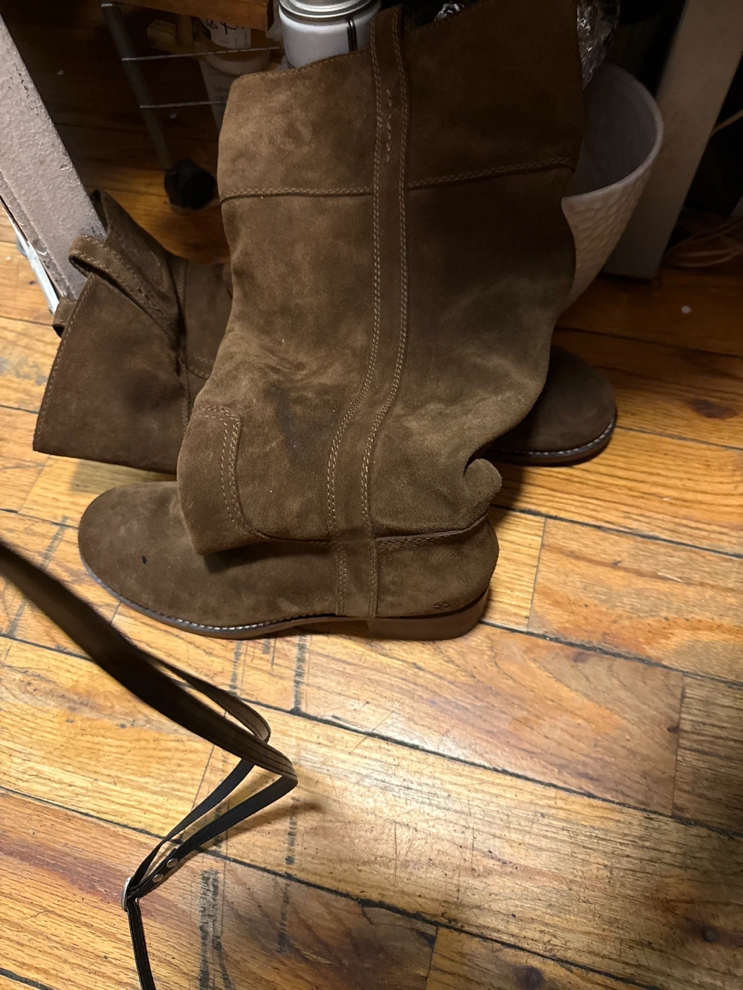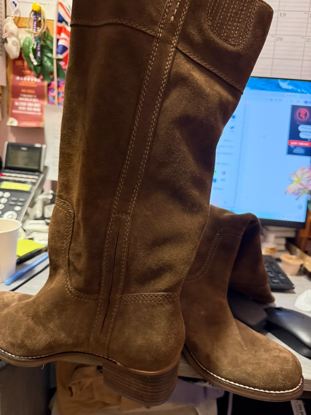 These are Lucky Brand brown suede knee-high boots. Leather upper with a textile/man-made lining and sole. Size 8.5 M (US), 39.5 (EU).