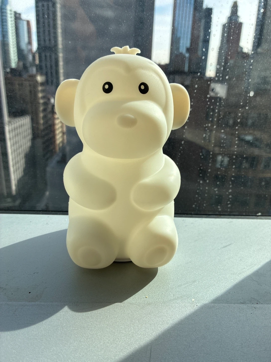 This is a cute monkey-shaped night light lamp. It's made of a soft, translucent material that emits various colors w. an option to demonstrate all colors in a looped sequence. The lamp is powered by a rechargeable battery and features a simple on/off button. It's a fun addition to any child's room!