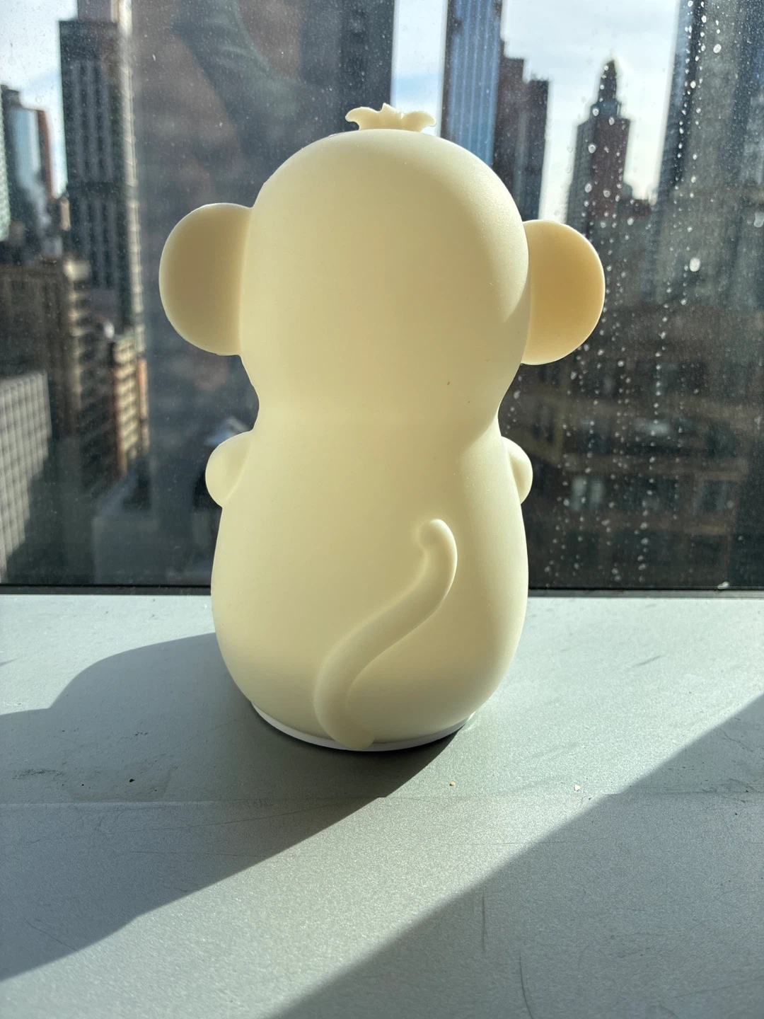 This is a cute monkey-shaped night light lamp. It's made of a soft, translucent material that emits various colors w. an option to demonstrate all colors in a looped sequence. The lamp is powered by a rechargeable battery and features a simple on/off button. It's a fun addition to any child's room!
