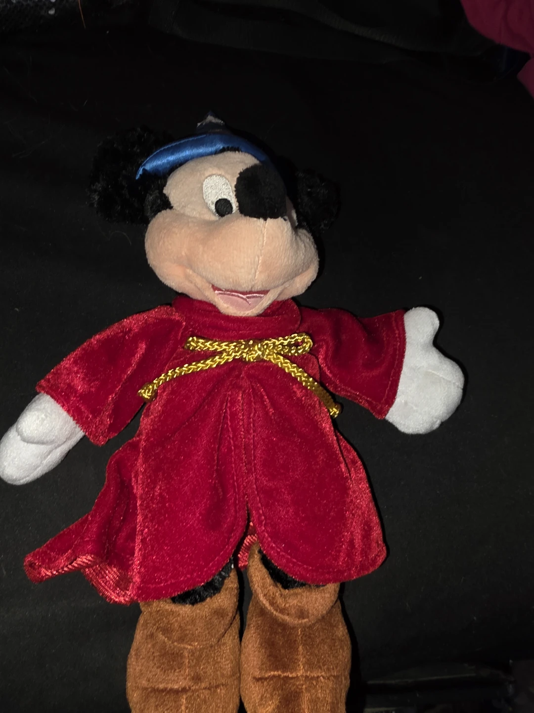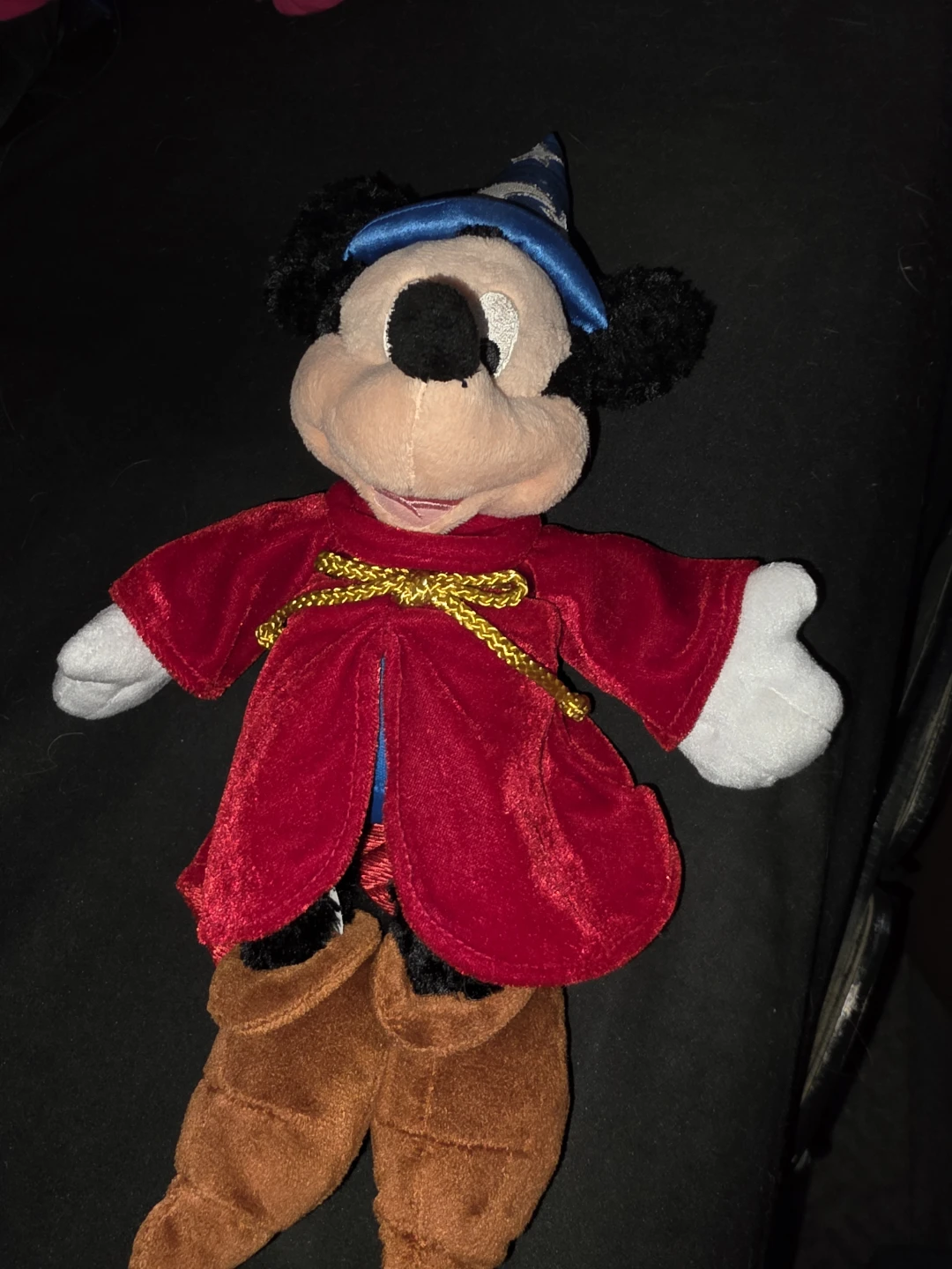 This plush toy features Mickey Mouse dressed as Sorcerer Mickey from Fantasia. It's soft and huggable. Perfect for Disney fans!