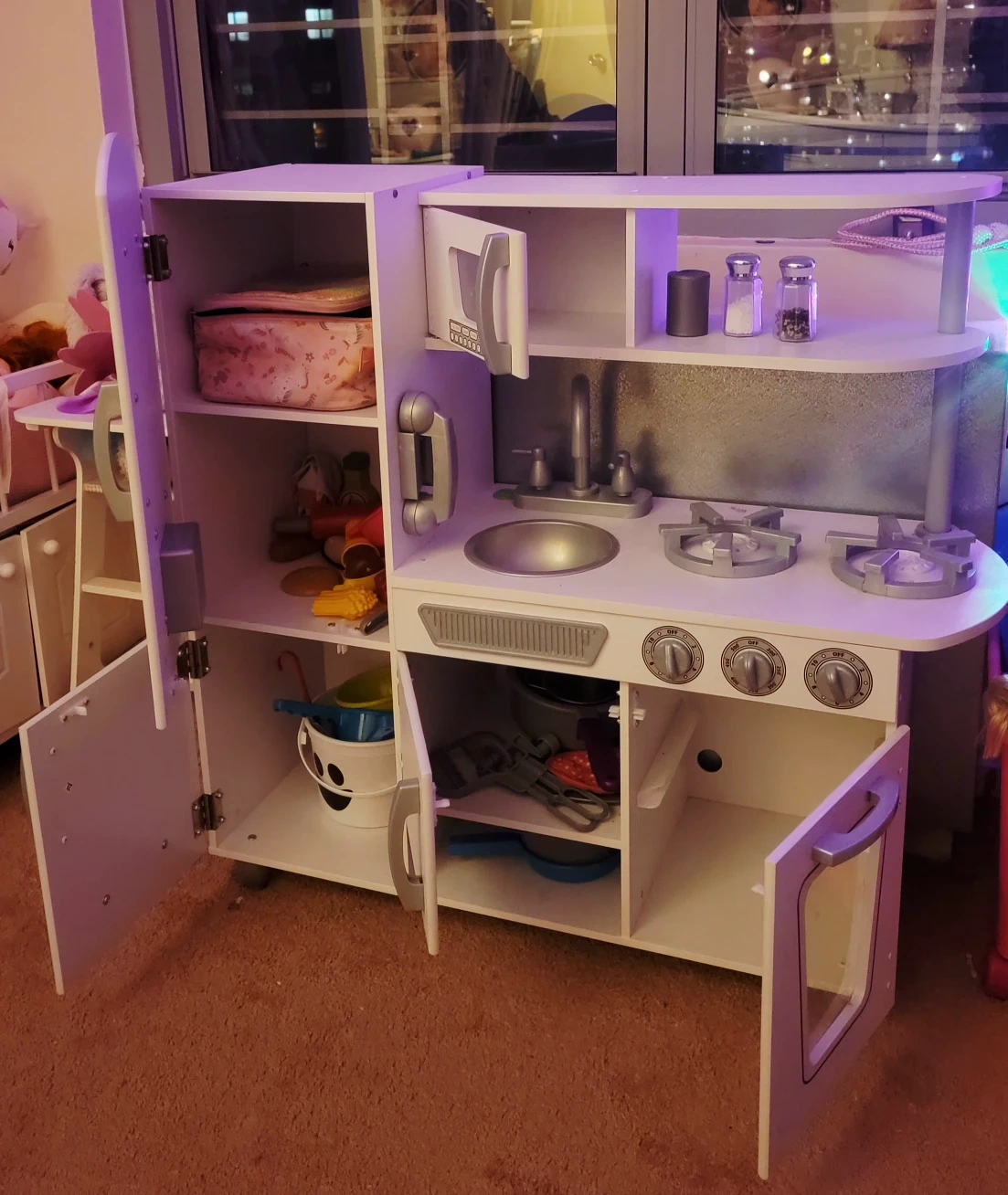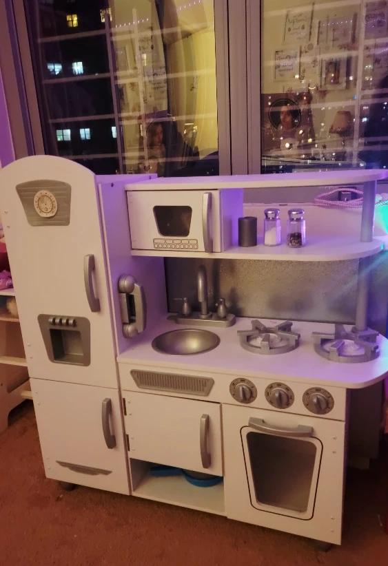 Selling a cute white wooden play kitchen for kids! has lots of fun features like a microwave, sink, and oven. 33in widex 34in hight. Perfect for imaginative play! It's has son crayon marks.