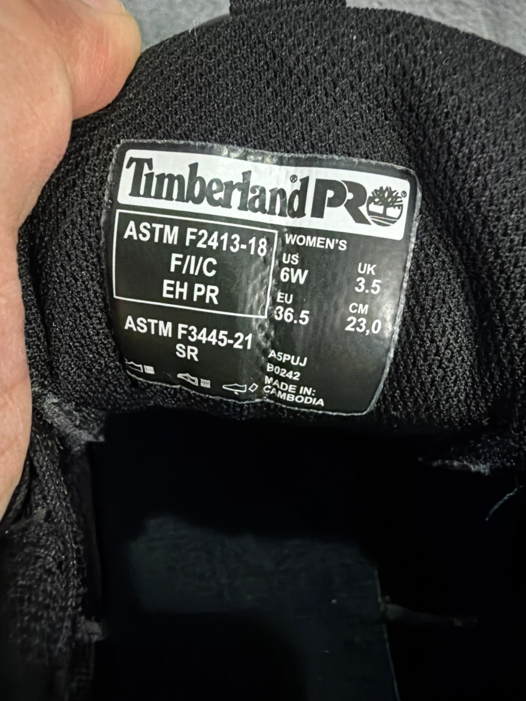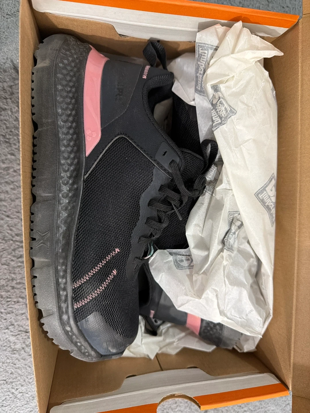 Timberland PRO women's black safety shoes with pink accents. These shoes meet ASTM F2413-18 standards for electrical hazard protection. Comes with original box.