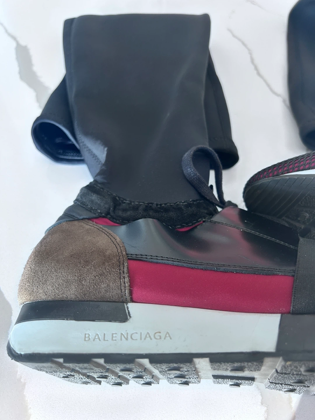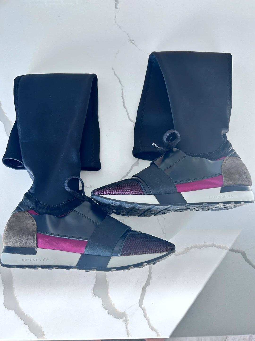 These Balenciaga sneakers feature a unique sock-like upper with a secure lacing system. They have a mixed material construction including mesh and suede accents. Size 40.