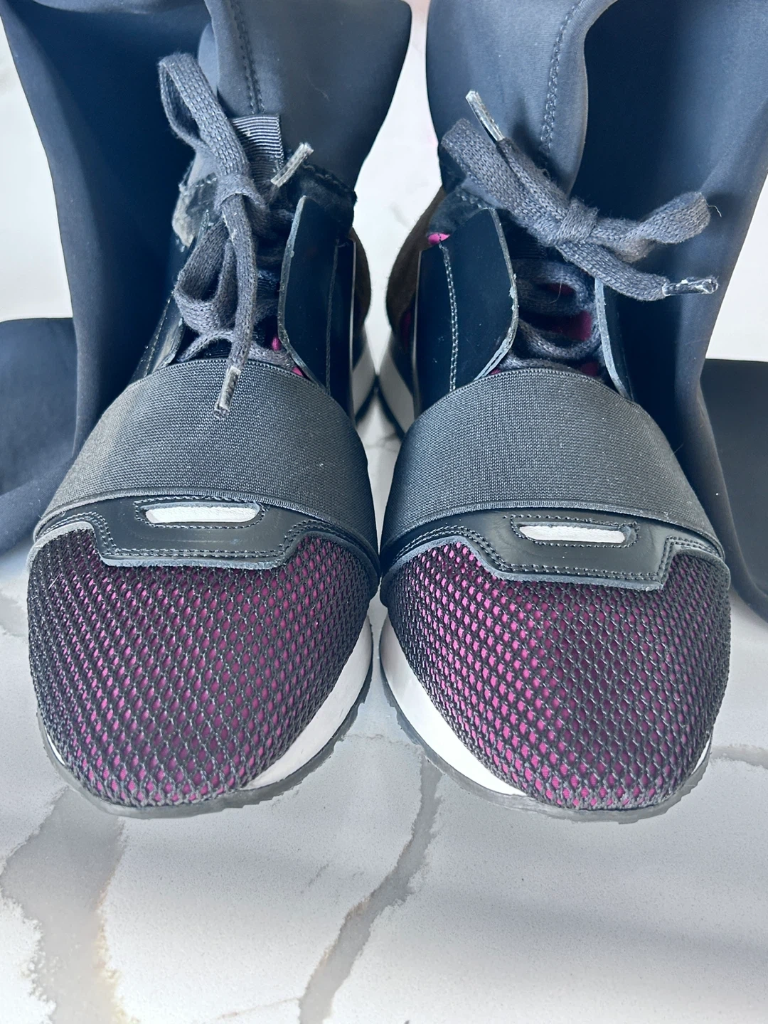 These Balenciaga sneakers feature a unique sock-like upper with a secure lacing system. They have a mixed material construction including mesh and suede accents. Size 40.