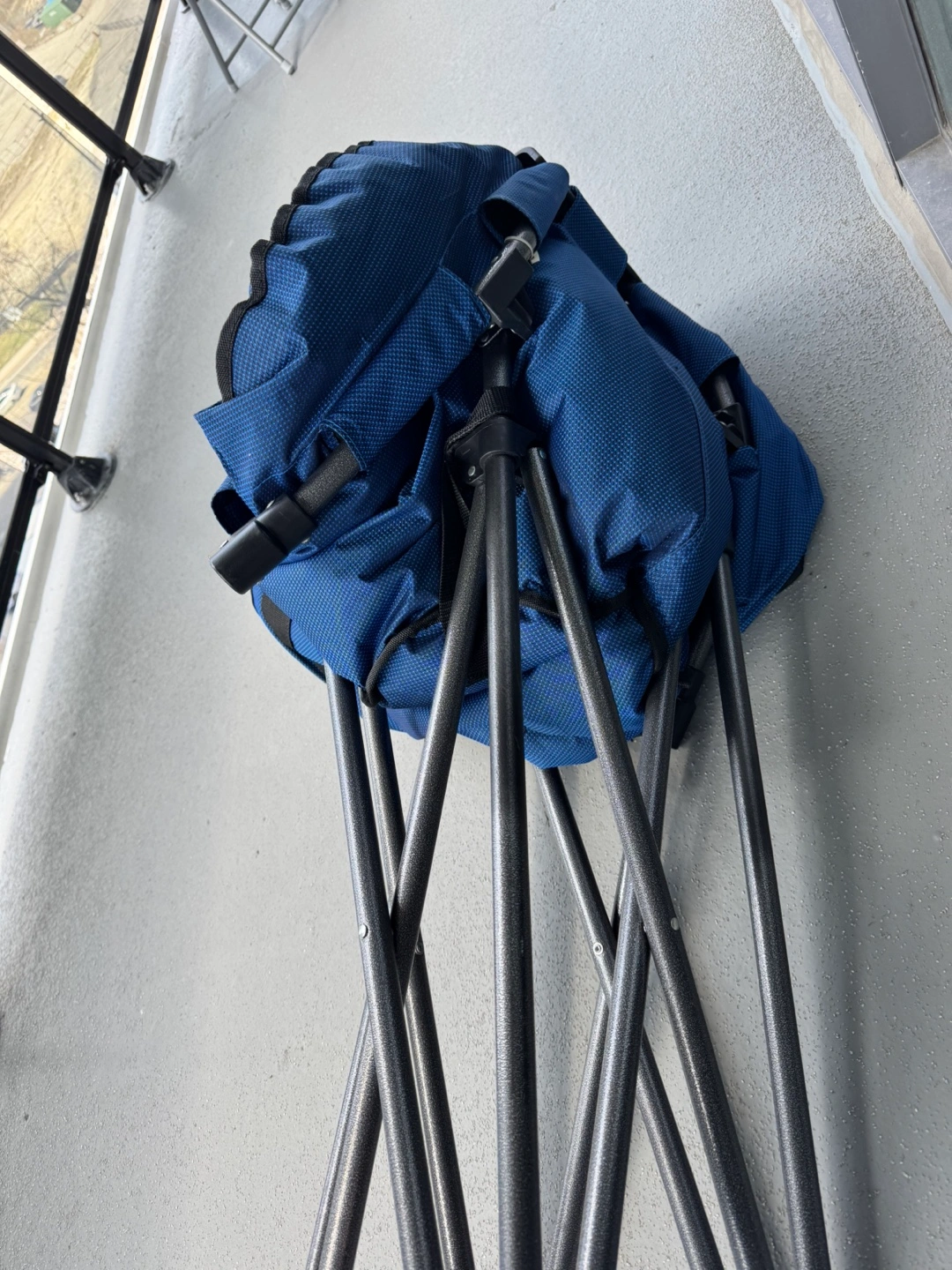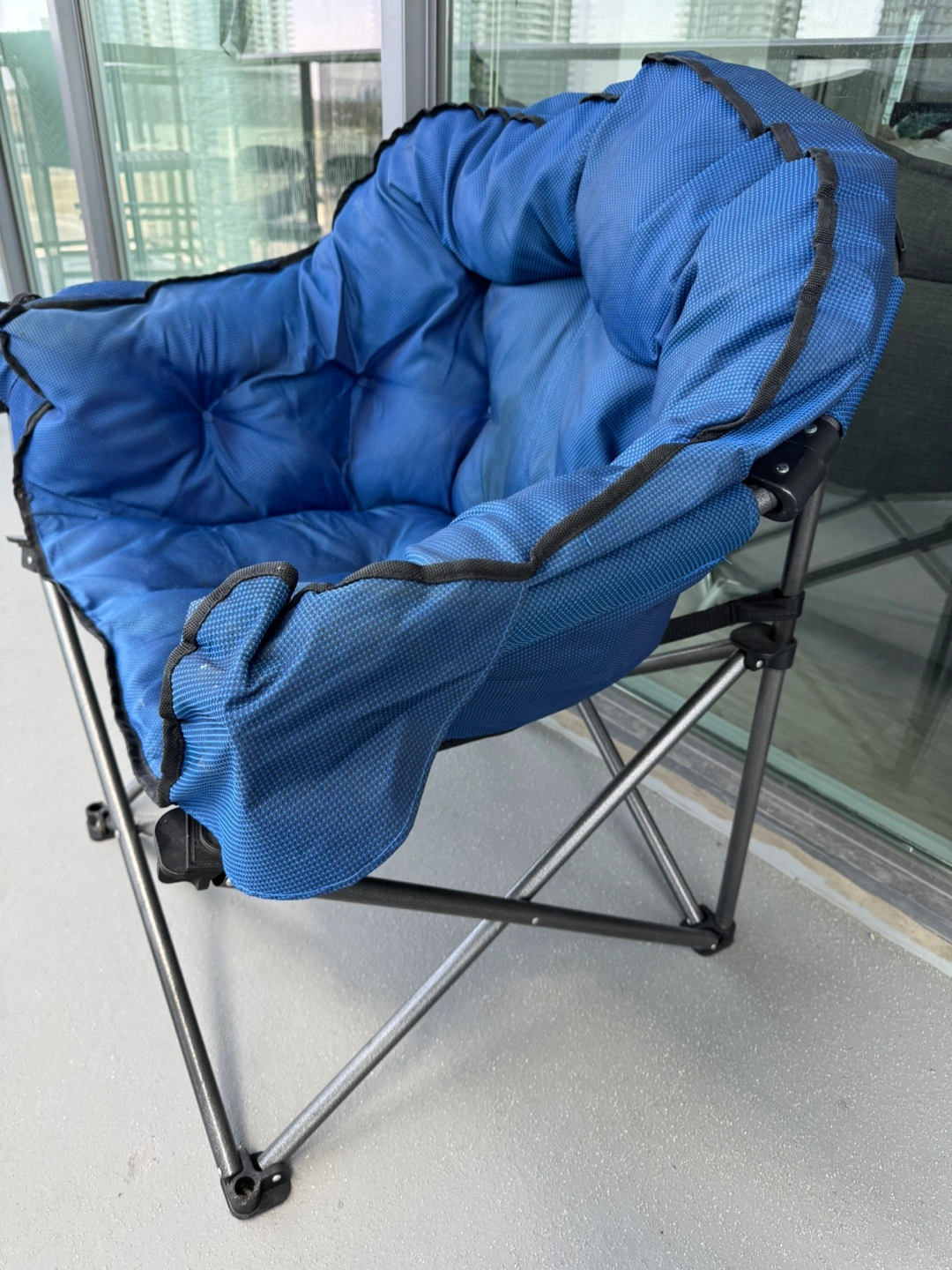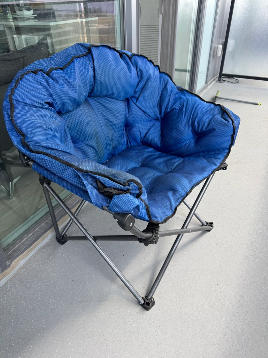 Portable folding chair. Durable metal frame. Blue fabric seat and back. Great for camping, outdoor events, or relaxing on the balcony.