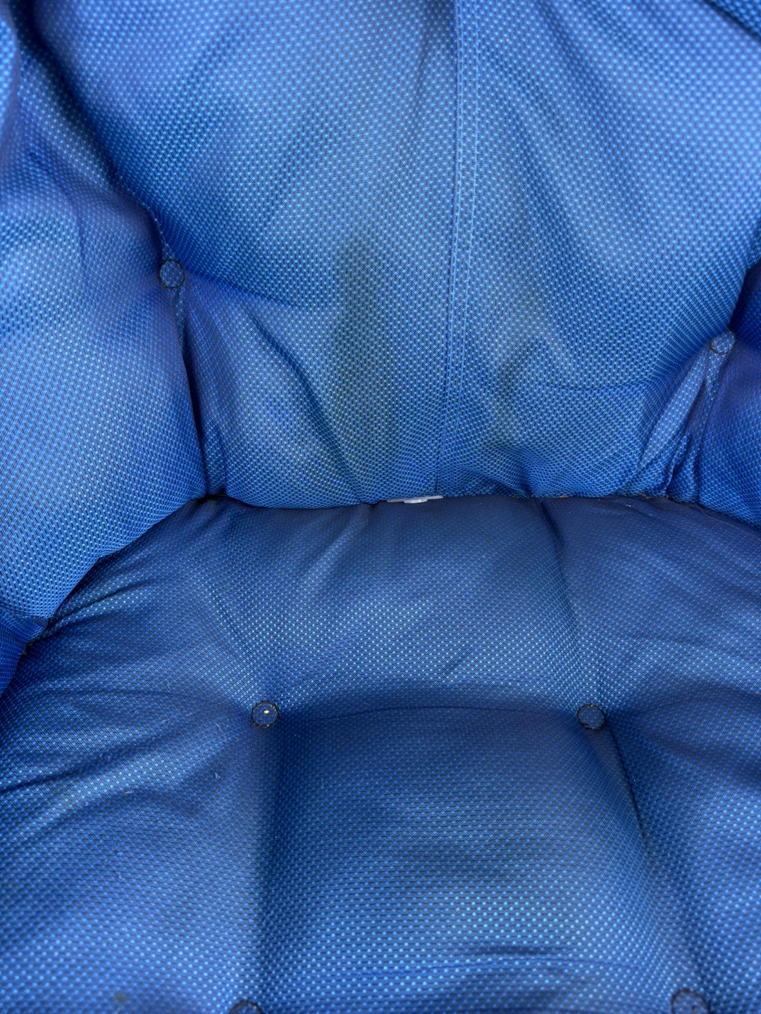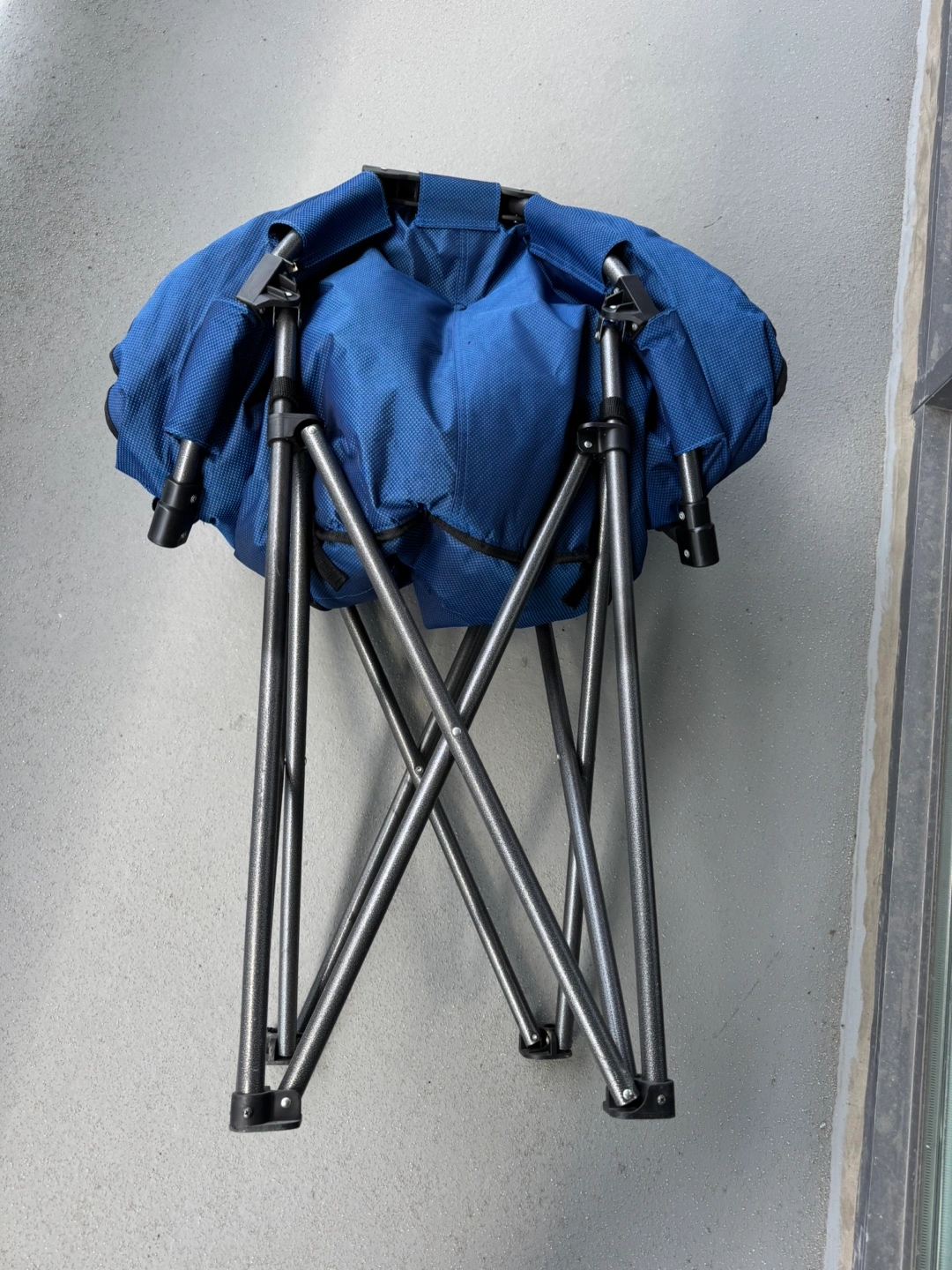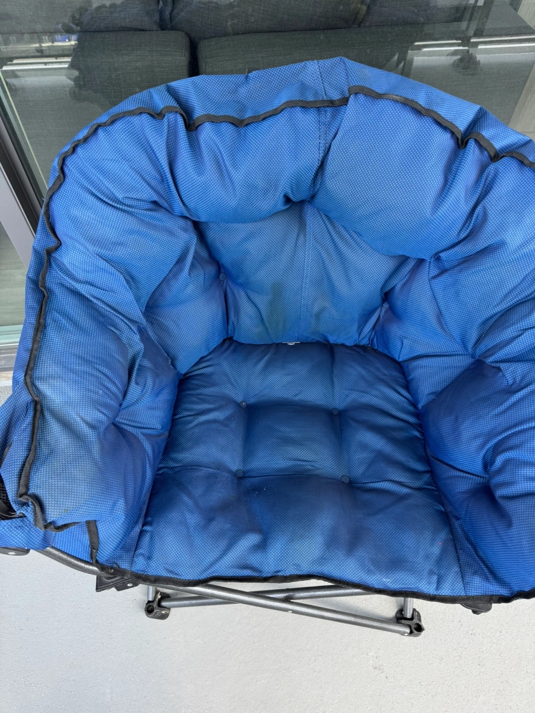 Portable folding chair. Durable metal frame. Blue fabric seat and back. Great for camping, outdoor events, or relaxing on the balcony.