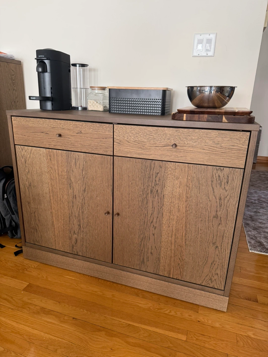 TONSTAD sideboard in brown stained oak veneer. It measures 47 1/2 x 18 5/8 x 35 3/8 inches. This piece offers two drawers and two cabinet doors for storage.
