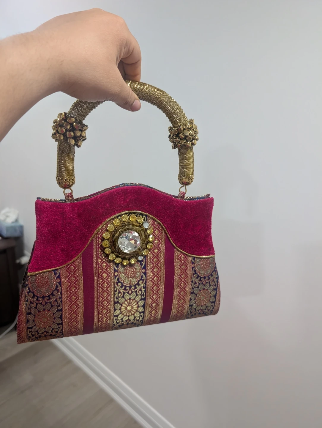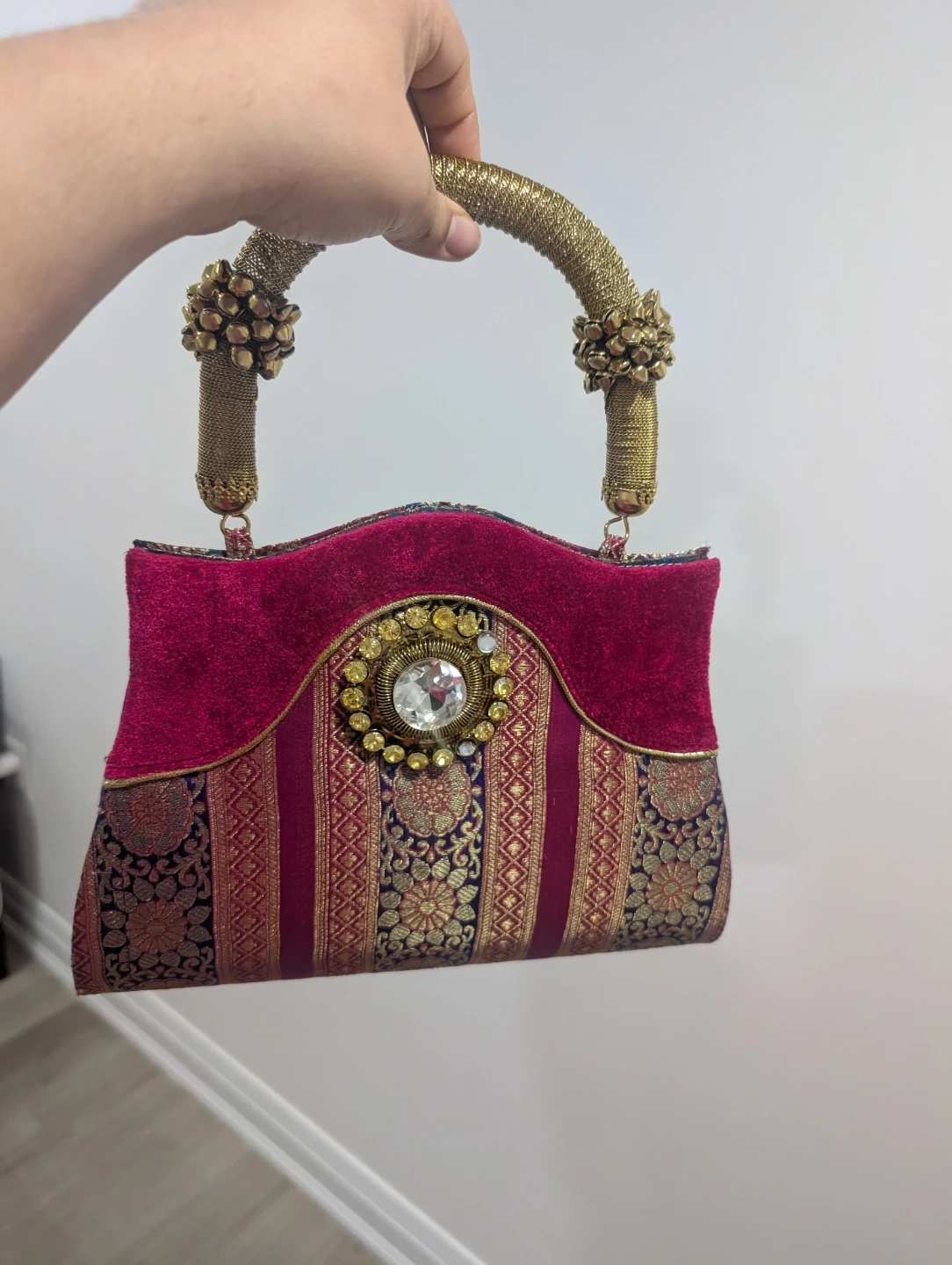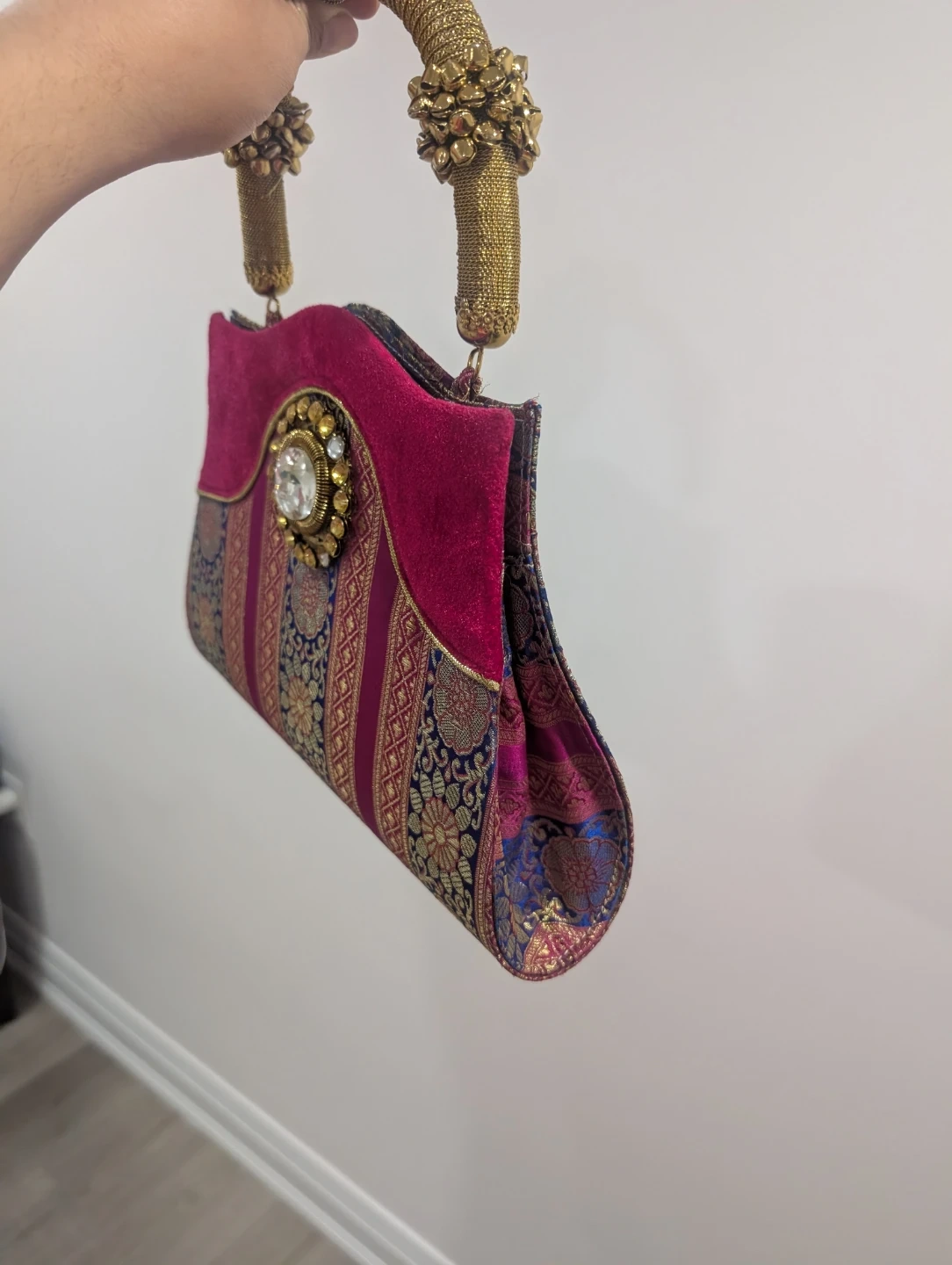 This eye-catching clutch features a rich magenta velvet top panel with a decorative jewel and gold thread detailing. The lower portion displays a vibrant woven fabric with intricate floral and geometric patterns in gold, blue, and pink. It has distinctive golden rope handles adorned with beaded accents. This bag's unique design makes it a statement piece for special occasions.