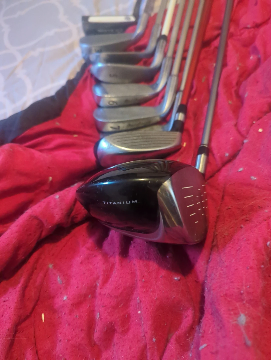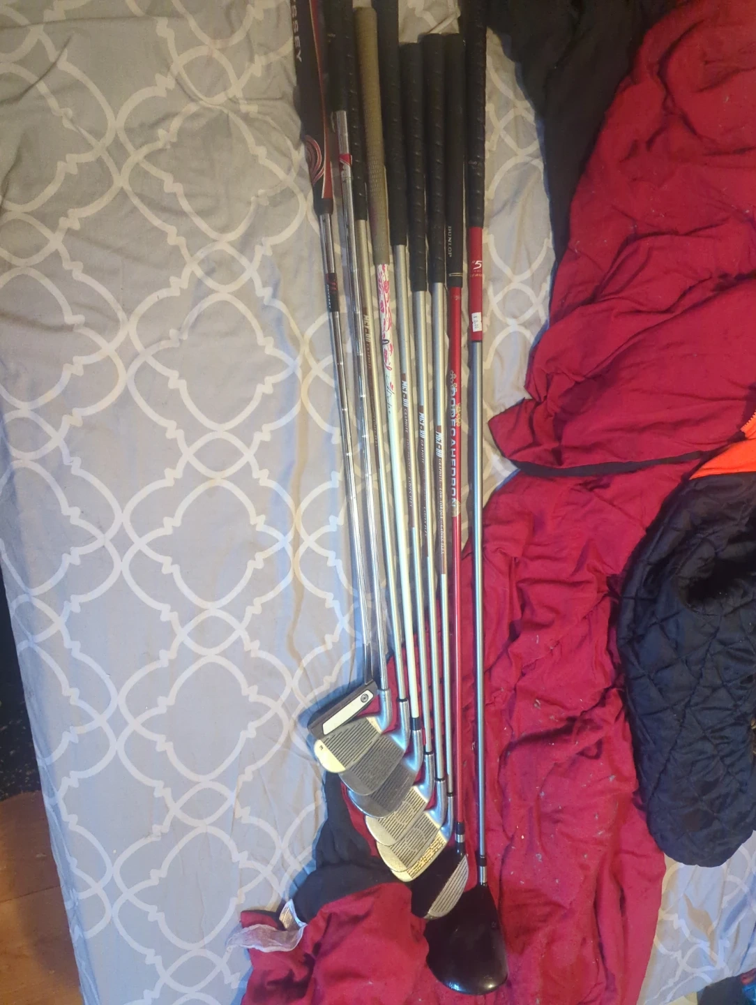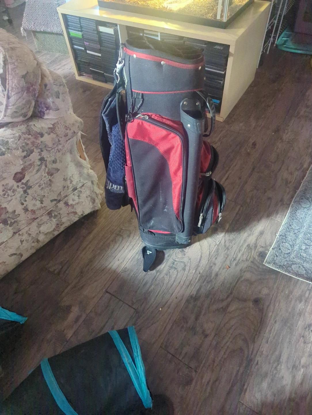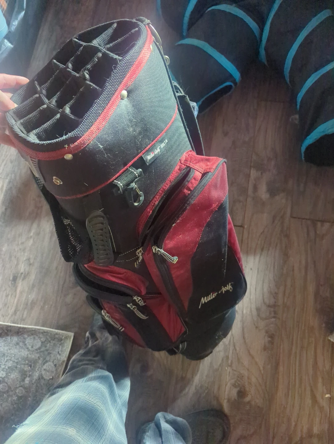This is a Miller Golf bag filled with various golf clubs. It has multiple pockets for storage. Clubs include irons and a driver. Ready for the course!