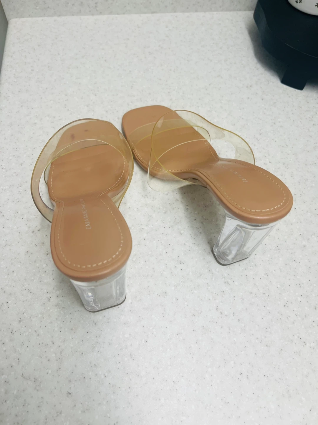 These Zara Basic Collection sandals are in great condition! They feature a clear block heel and clear straps, perfect for adding a modern touch to any outfit.