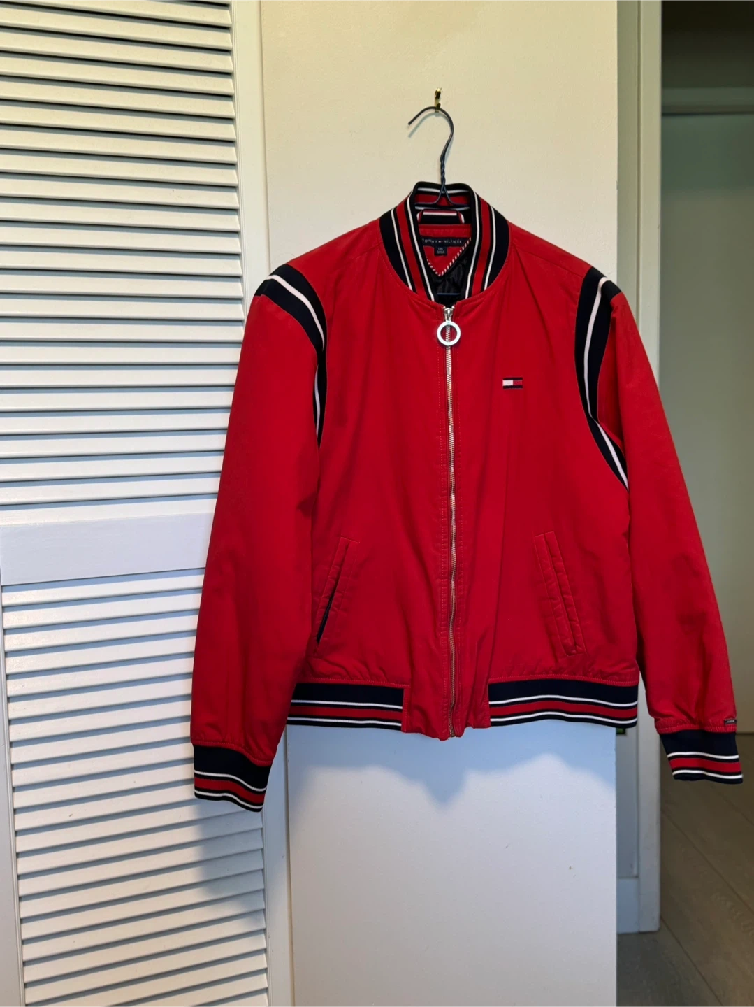 Tommy Hilfiger bomber jacket in a vibrant red. Features classic striped trim on the collar, cuffs, and hem. It has a full zipper closure with two front pockets. This jacket's design makes it a versatile layer for casual wear.