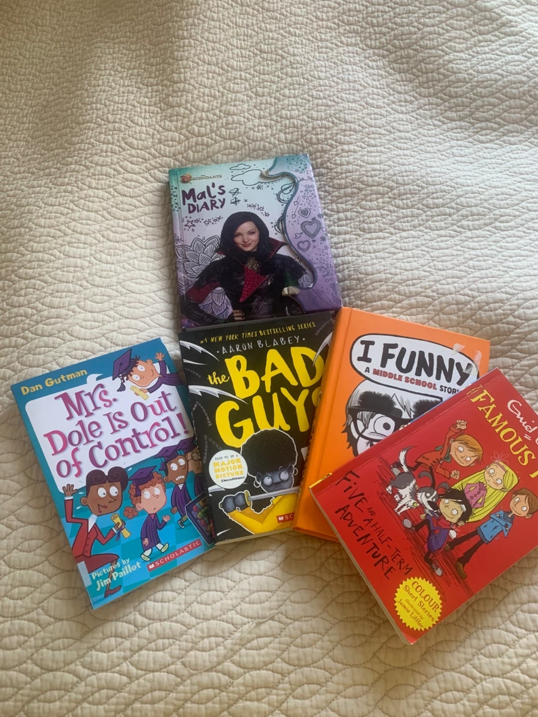 Bundle of five children's books including 'Mal's Diary', 'The Bad Guy', 'Mrs. Dole Is Out of Control!', 'I Funny: A Middle School Story', and 'The Famous Five: A Half-Term Adventure'. These books are great for young readers.