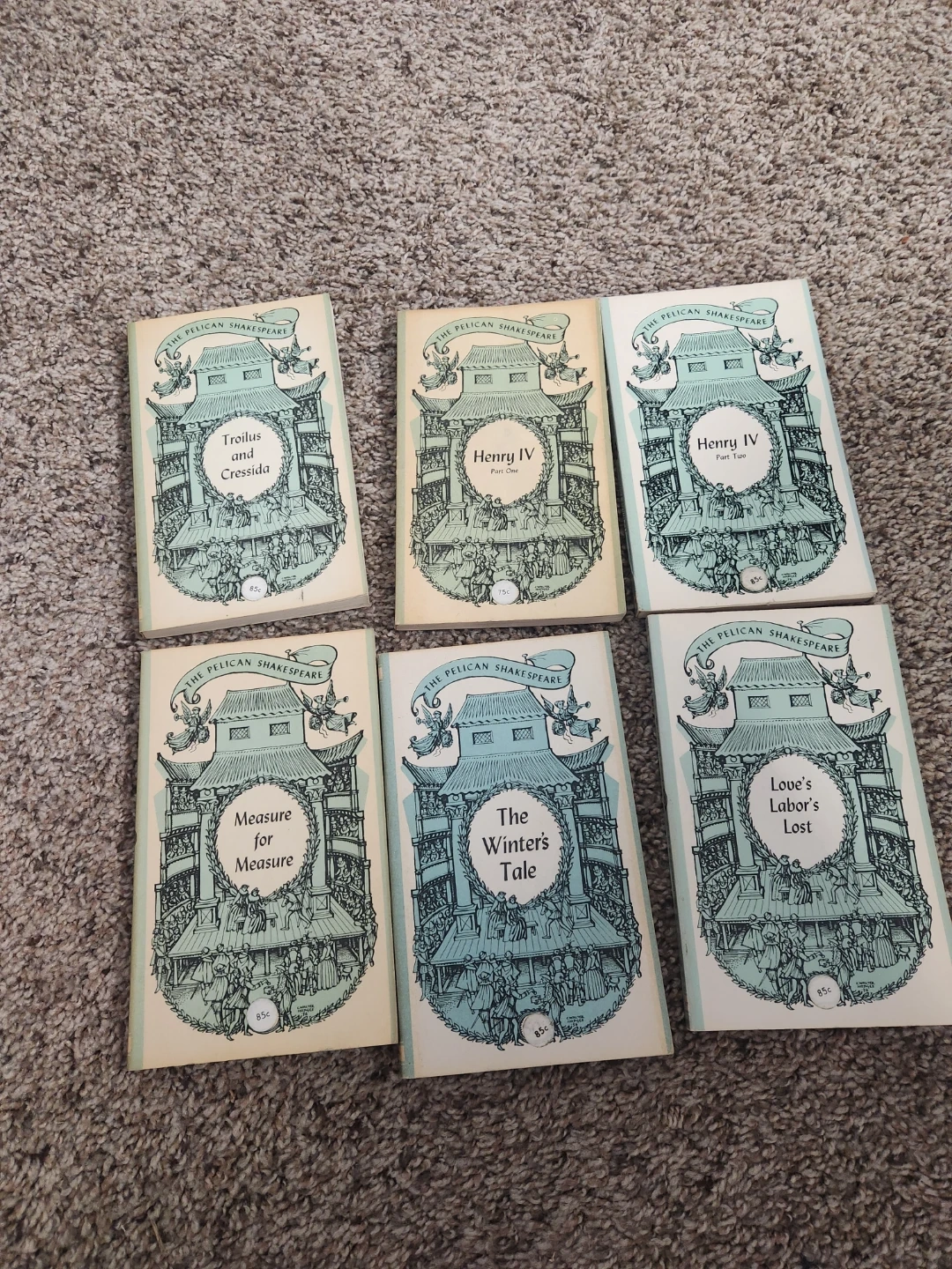 This is a set of six books from The Pelican Shakespeare series. The collection includes: Henry IV, Part One; Henry IV, Part Two; Love's Labour's Lost; Measure for Measure; The Winter's Tale; and Troilus and Cressida. These books are paperbacks with a consistent design.