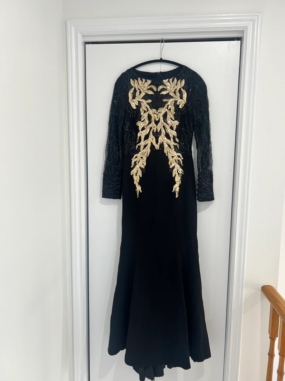 Beautiful black formal gown with gold embellishments! The dress features long sleeves and a fitted silhouette. Perfect for a special occasion!