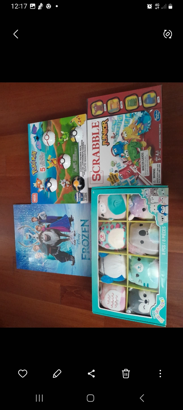 I am selling brand new kids' items, including a Squishmallows 8-piece set, Frozen poster book, Scrabble Junior, and Pokemon Mega Construx set.