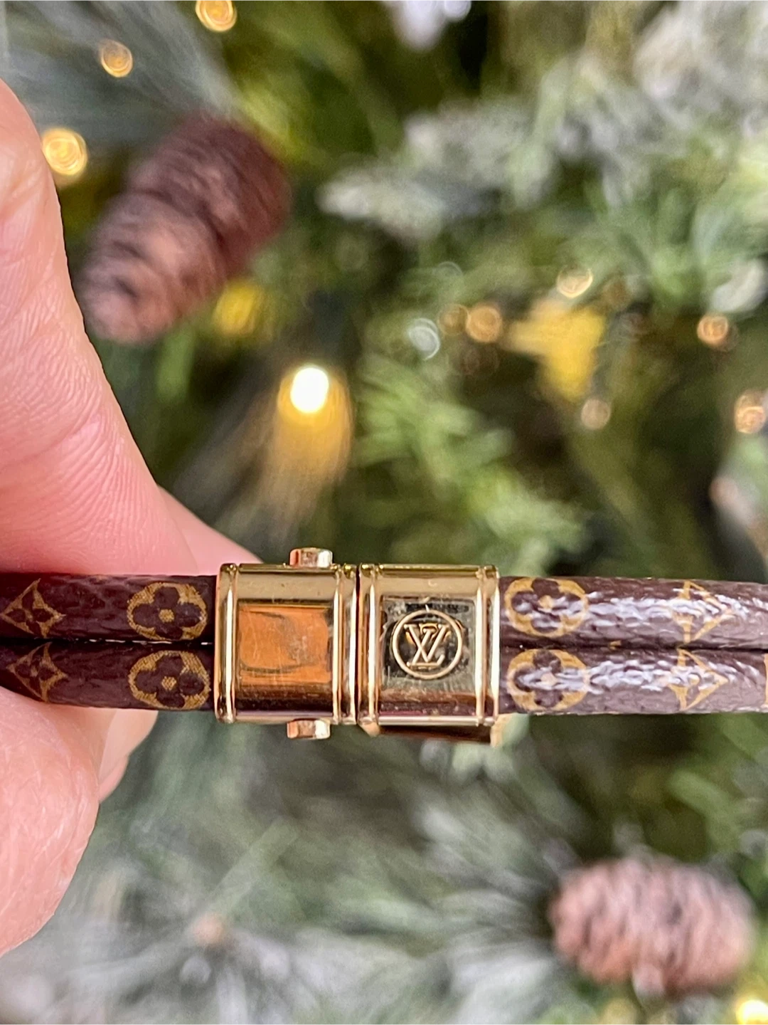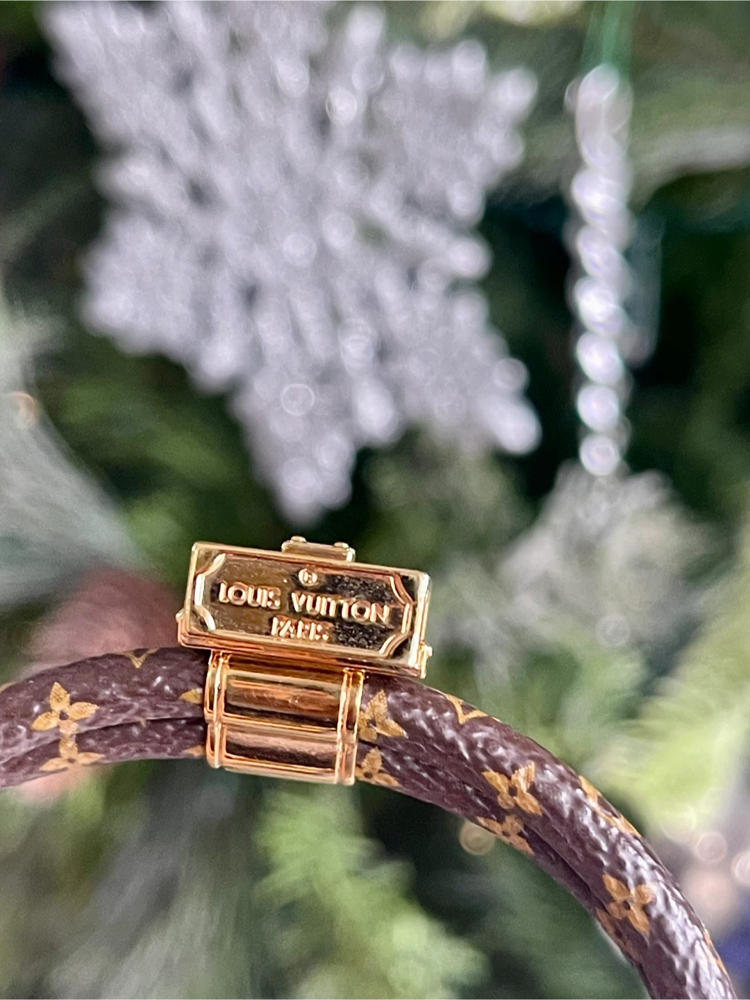 Selling a stylish Louis Vuitton bracelet featuring the iconic monogram pattern. It's in great condition and comes with the original box. The bracelet also has a gold-tone lock charm, adding a touch of luxury to your wrist