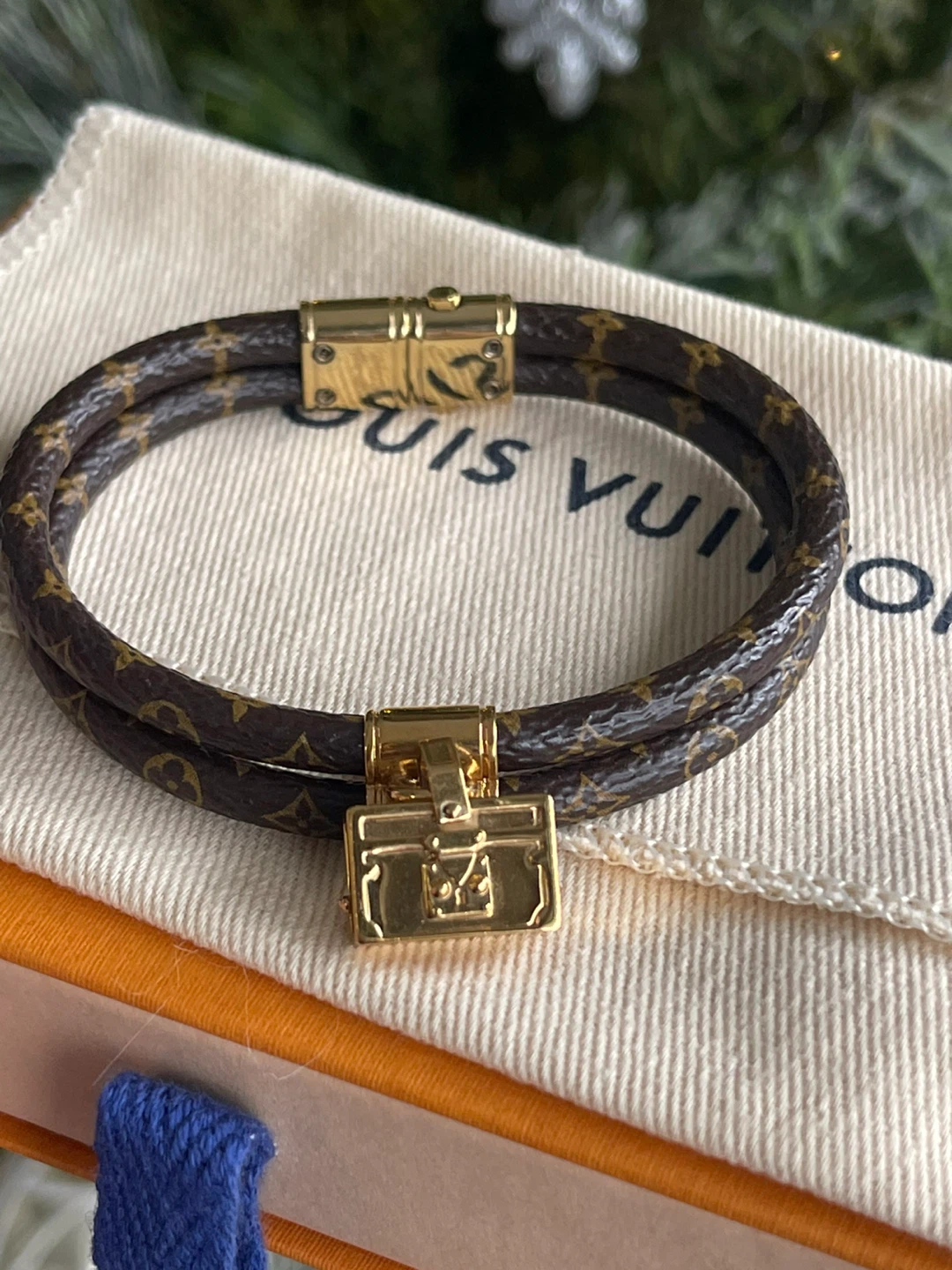 Selling a stylish Louis Vuitton bracelet featuring the iconic monogram pattern. It's in great condition and comes with the original box. The bracelet also has a gold-tone lock charm, adding a touch of luxury to your wrist