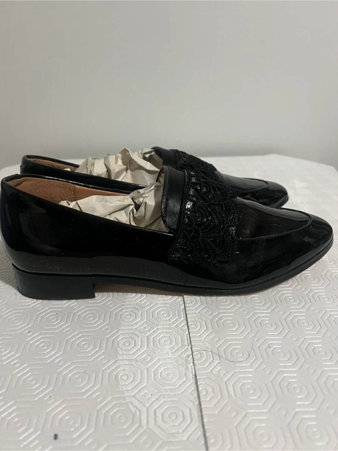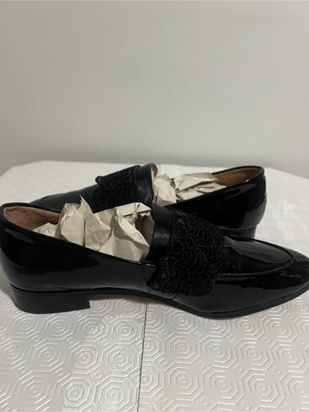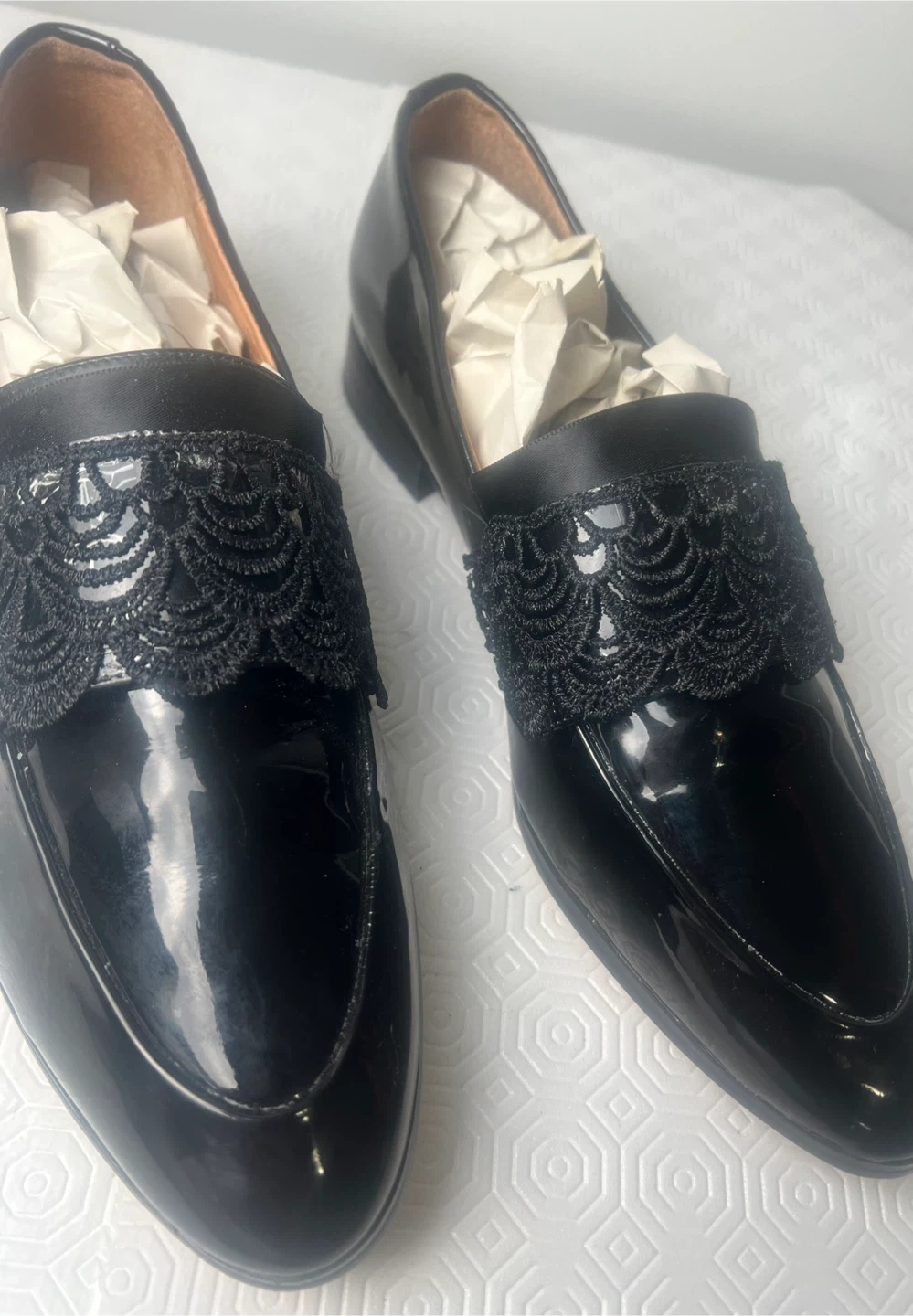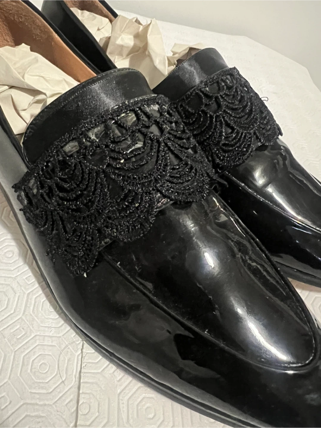Shiny black patent loafers, featuring decorative black lace and ribbon detailing across the vamp. These slip-on shoes have a sleek, pointed toe. Leather lining and sole.