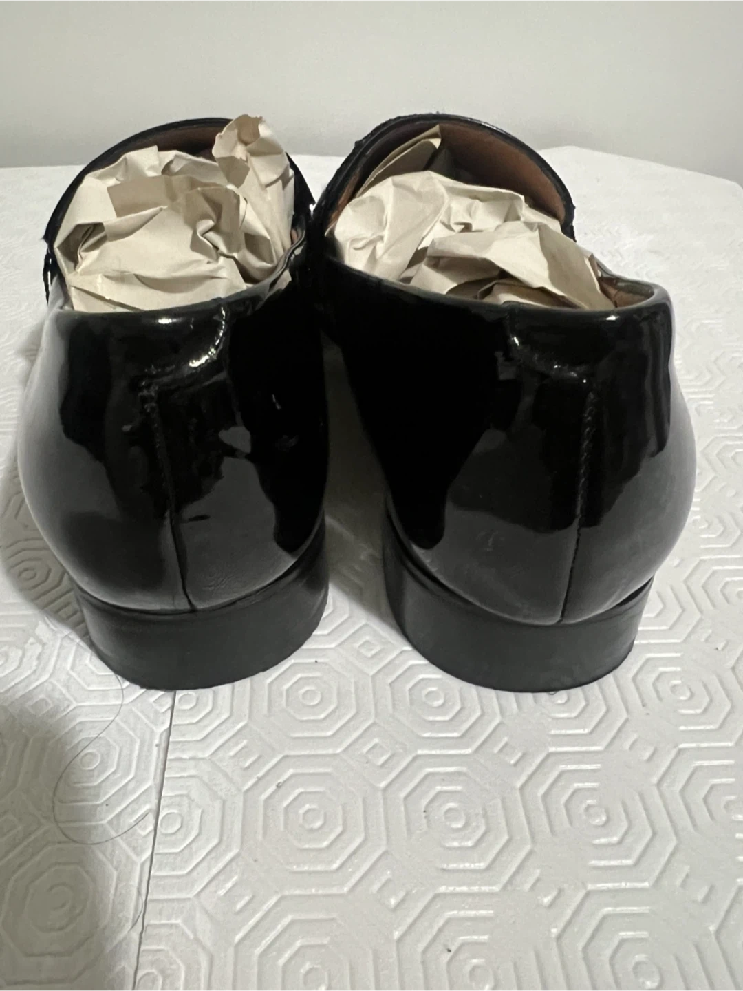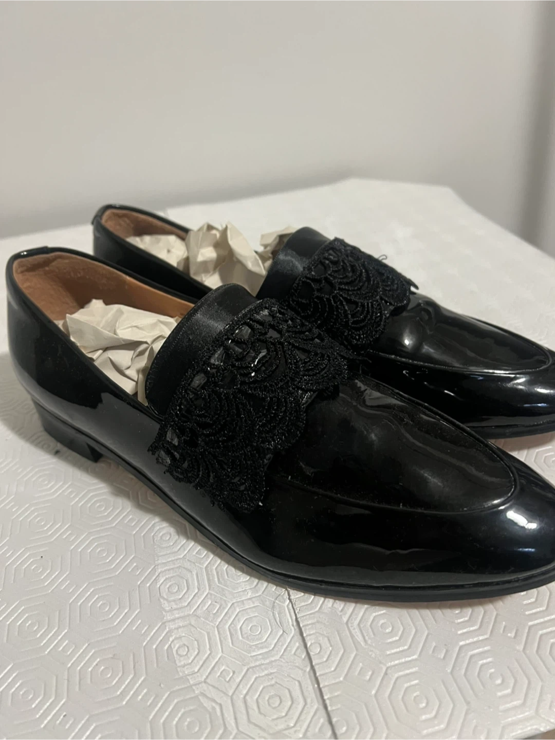 Shiny black patent loafers, featuring decorative black lace and ribbon detailing across the vamp. These slip-on shoes have a sleek, pointed toe. Leather lining and sole.