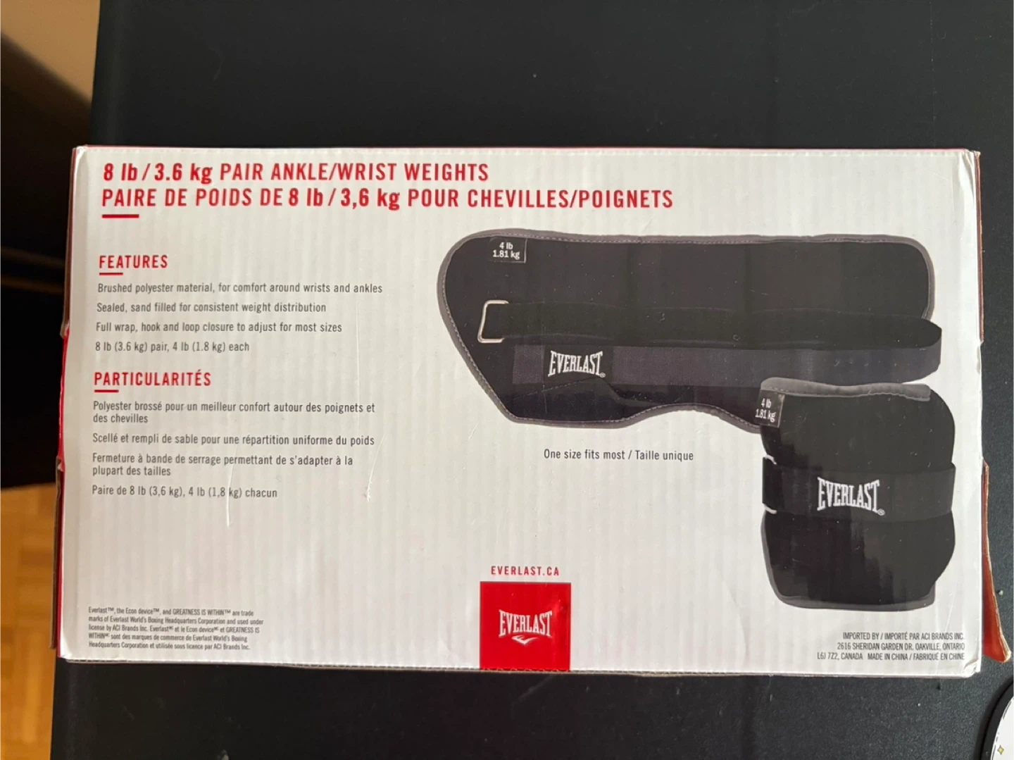 These Everlast ankle/wrist weights come in a pair, each weighing 4 lb for a total of 8 lb. They're made with brushed polyester material and feature a full wrap, hook and loop closure for an adjustable fit. This set is one size fits most.
