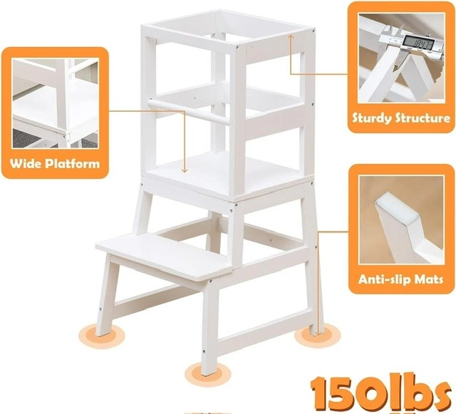White wooden toddler learning tower. Two-step design. Sturdy construction. Wide platform. Anti-slip mats. Suitable for children aged 18-36 months. Maximum weight capacity 150 lbs.