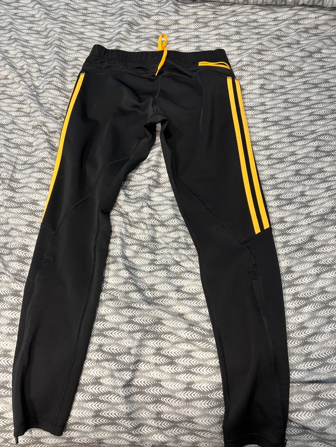 Black Adidas track pants with yellow side stripes and an orange drawstring. These pants feature a zippered pocket on the back. They're made from a lightweight, athletic material.