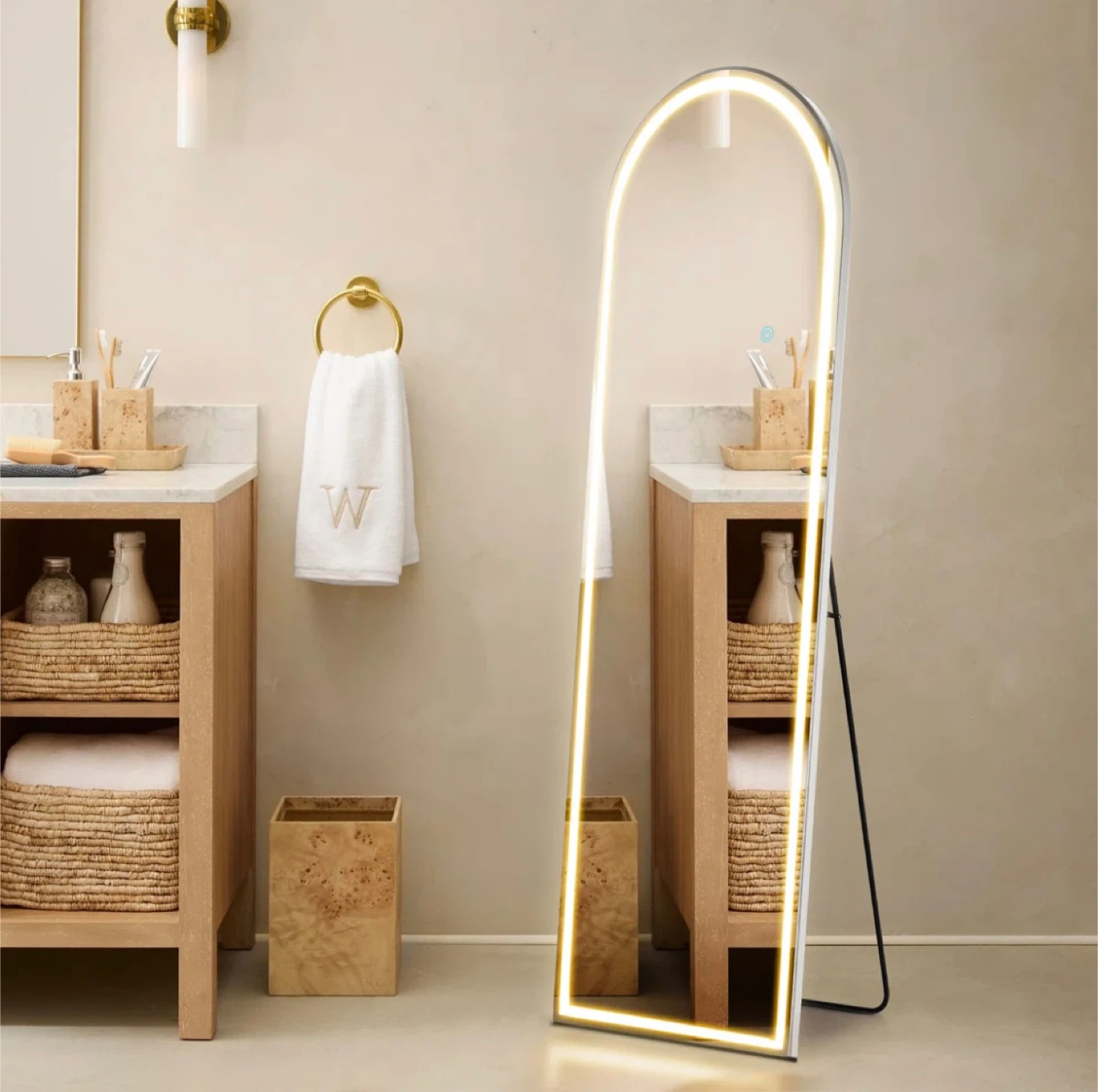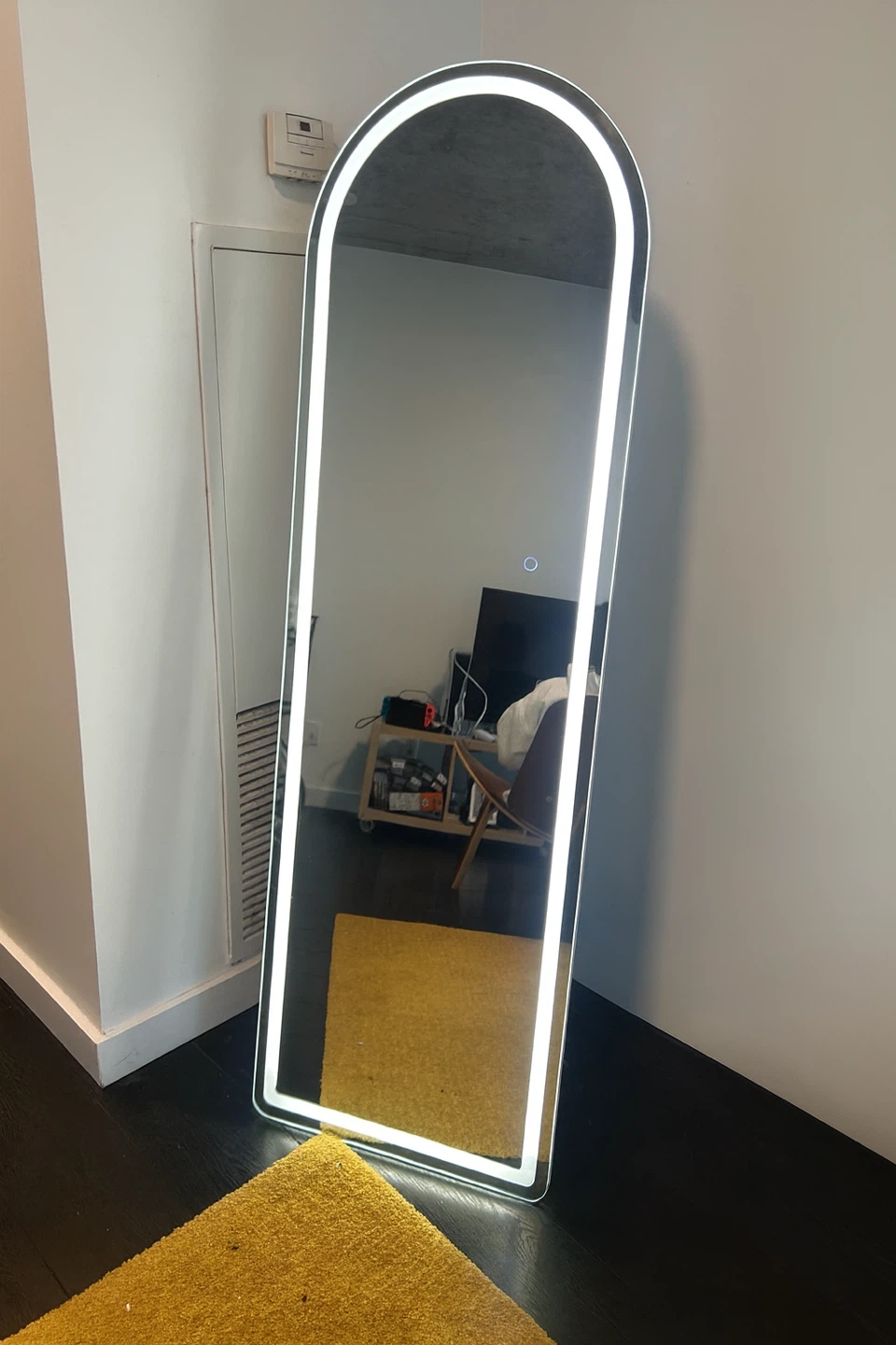 You can find it on Wayfair as ‘Arched LED Metal Floor Mirror’.