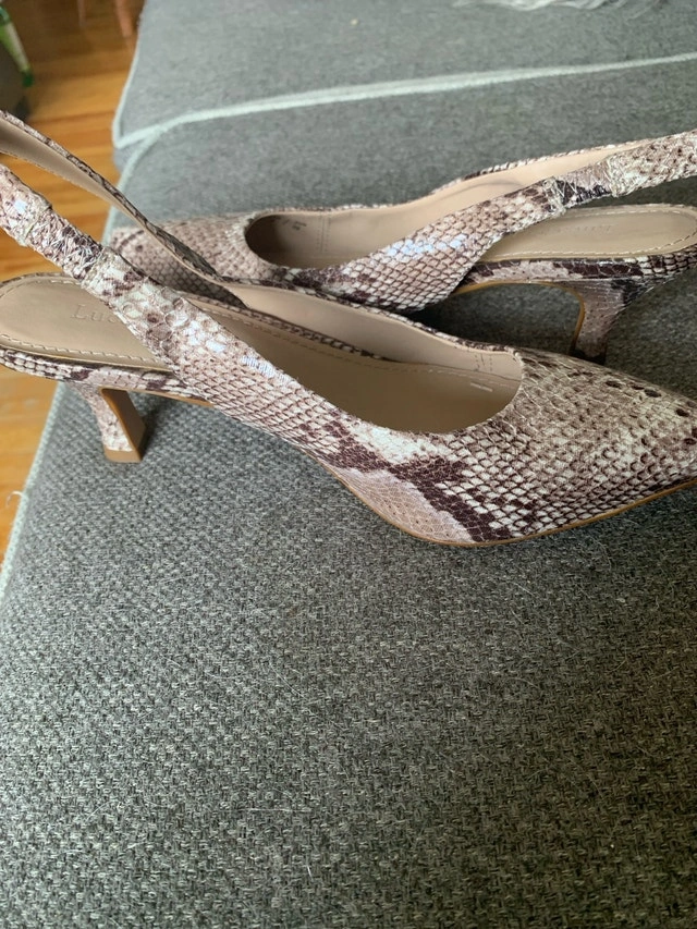 Step out in style with these Luca Ferri snakeskin print kitten heels, a chic addition to any wardrobe! These slingback heels feature a pointed toe and a comfortable kitten heel, perfect for adding a touch of elegance to your look. They are in used condition, so please see images for details. Brand: Luca Ferri Style: Slingback Kitten Heel Print: Snakeskin Size: EU 38 (approximately a size 7. Condition: Used - Good. Cash accepted.