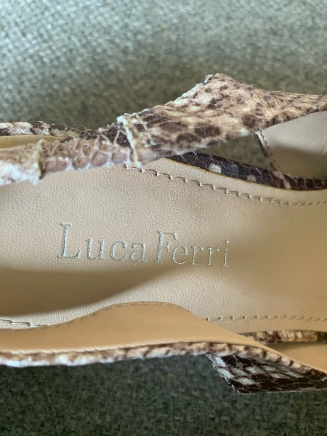 Step out in style with these Luca Ferri snakeskin print kitten heels, a chic addition to any wardrobe! These slingback heels feature a pointed toe and a comfortable kitten heel, perfect for adding a touch of elegance to your look. They are in used condition, so please see images for details. Brand: Luca Ferri Style: Slingback Kitten Heel Print: Snakeskin Size: EU 38 (approximately a size 7. Condition: Used - Good. Cash accepted.