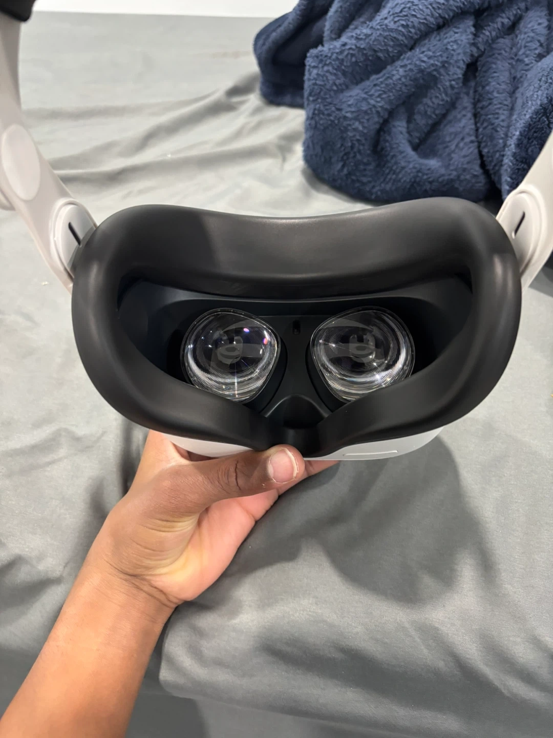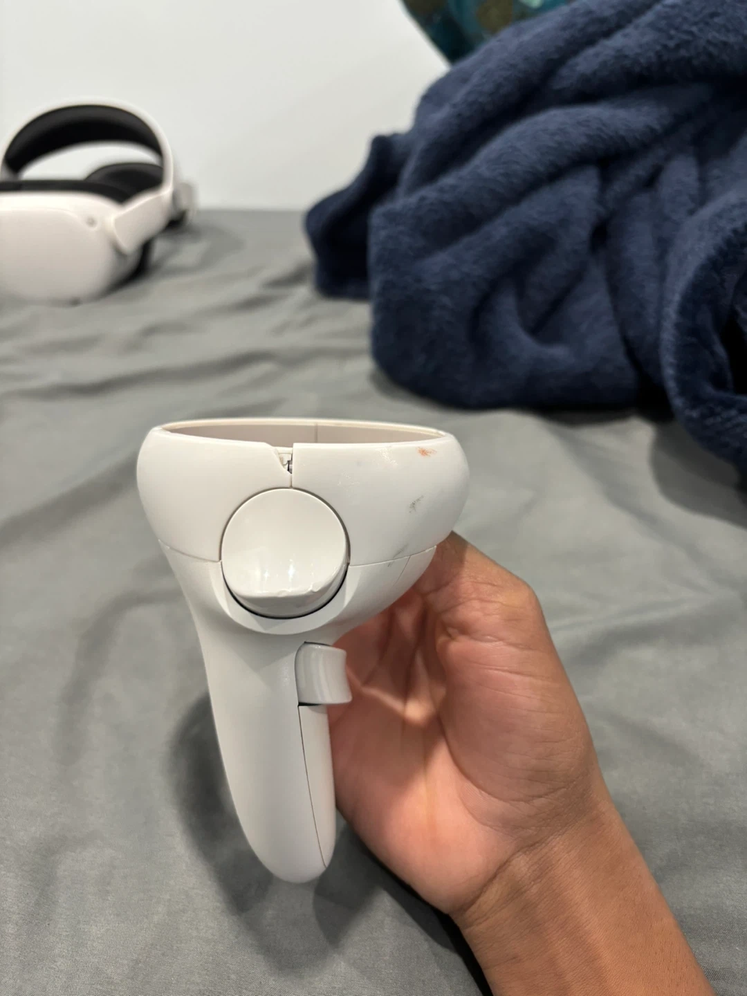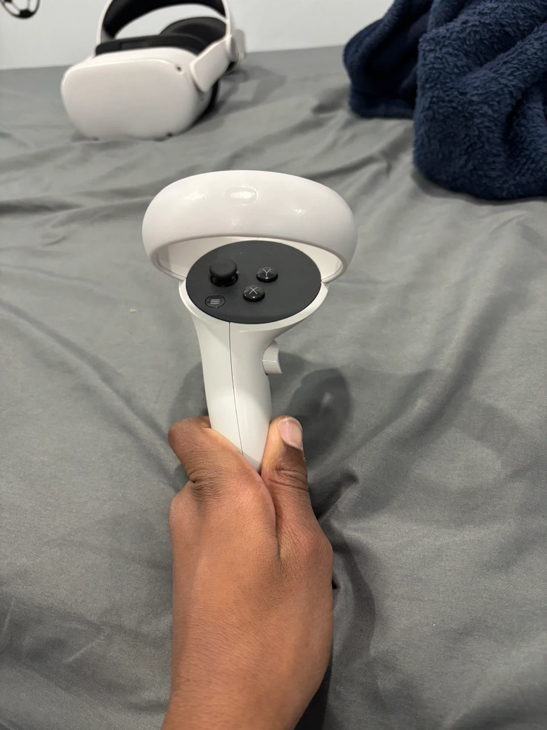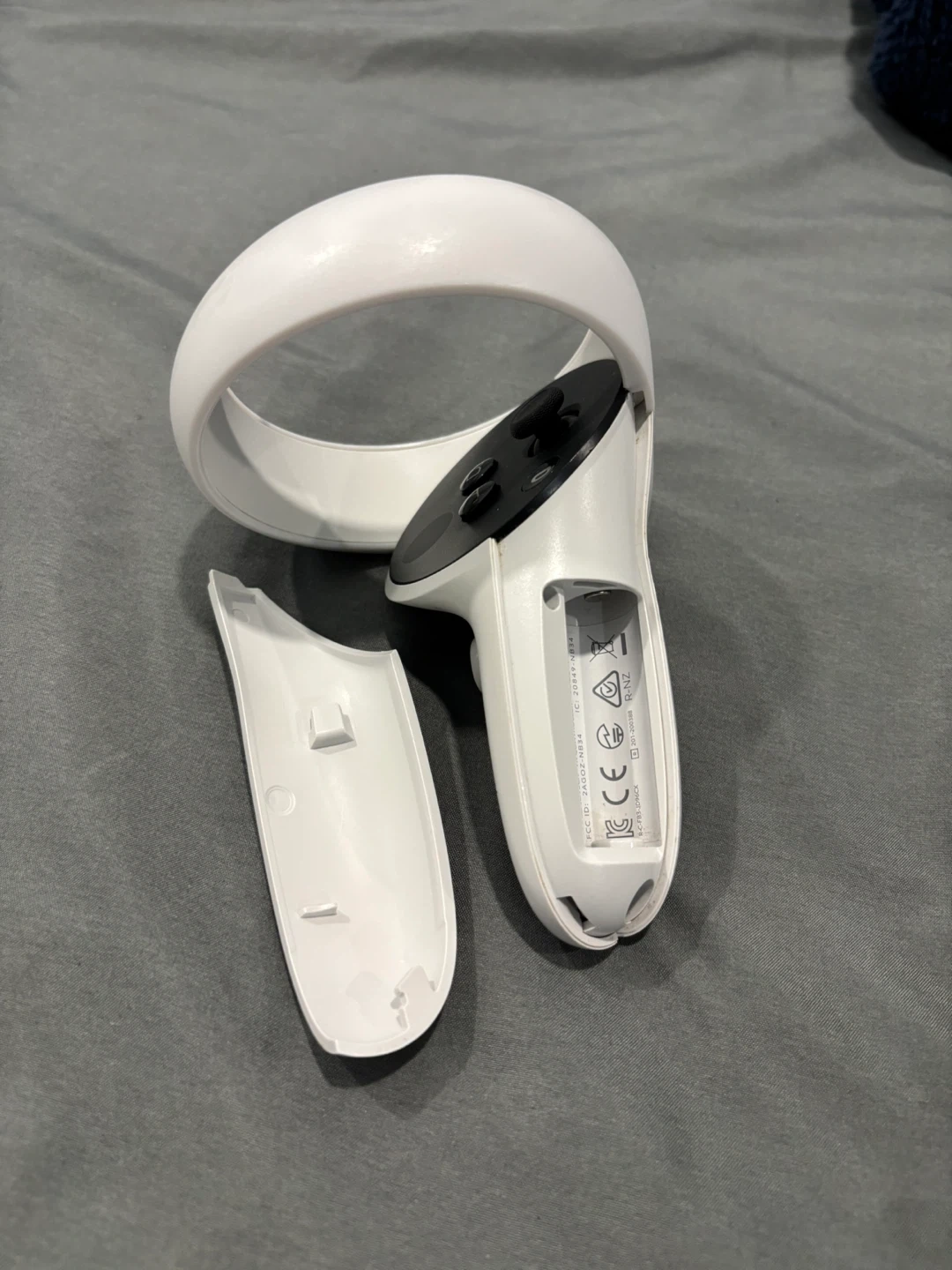 This is a white Meta Quest 2 VR headset. It comes with two controllers for an immersive experience. Includes the headset, head strap, controllers and charger. No batteries (AA batteries)