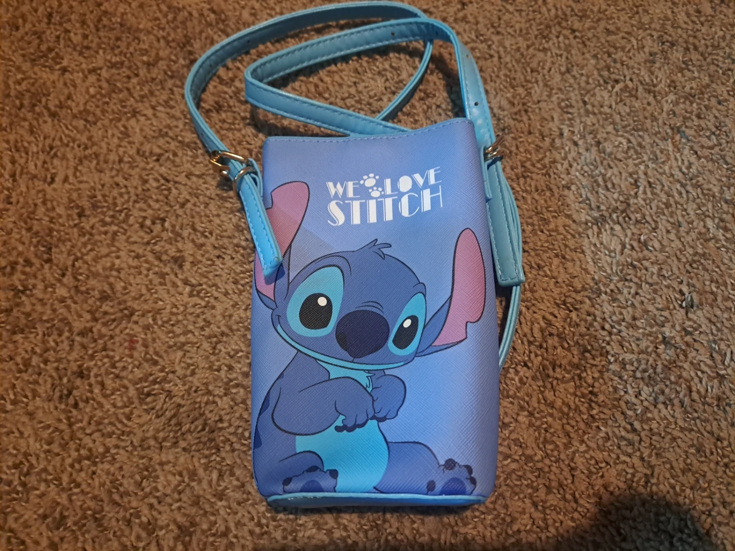 This cute blue mini crossbody bag features Stitch with the "We Love Stitch" text. It's perfect for carrying your essentials on the go. Made of faux leather with an adjustable strap.