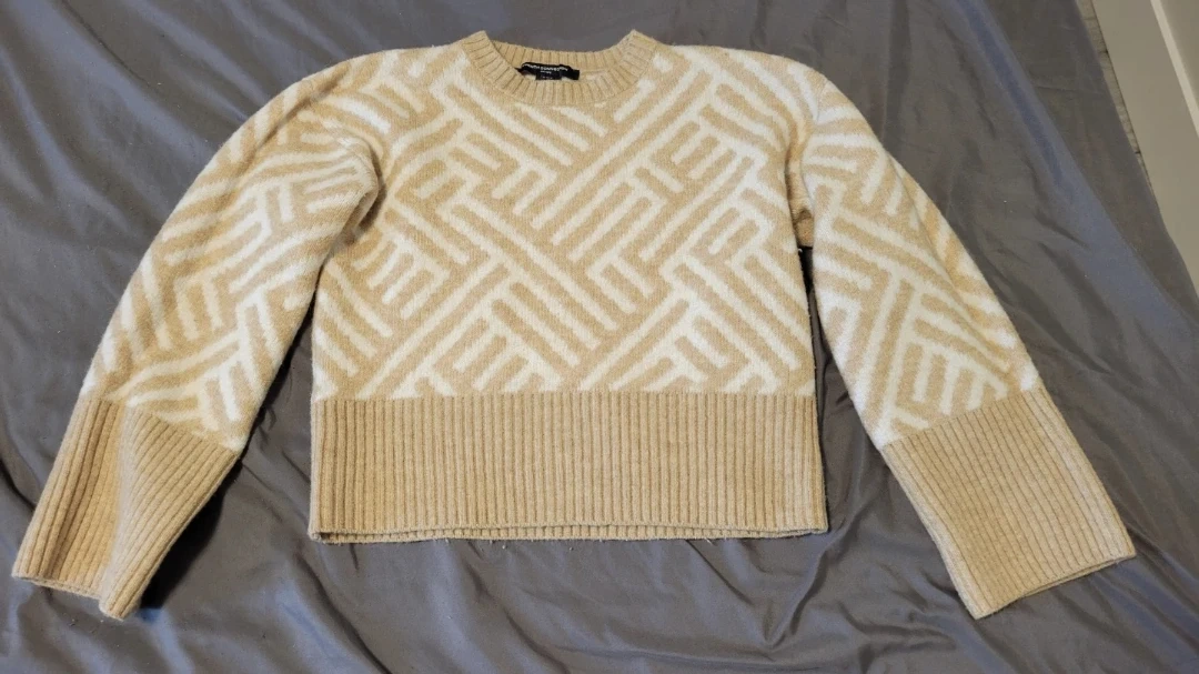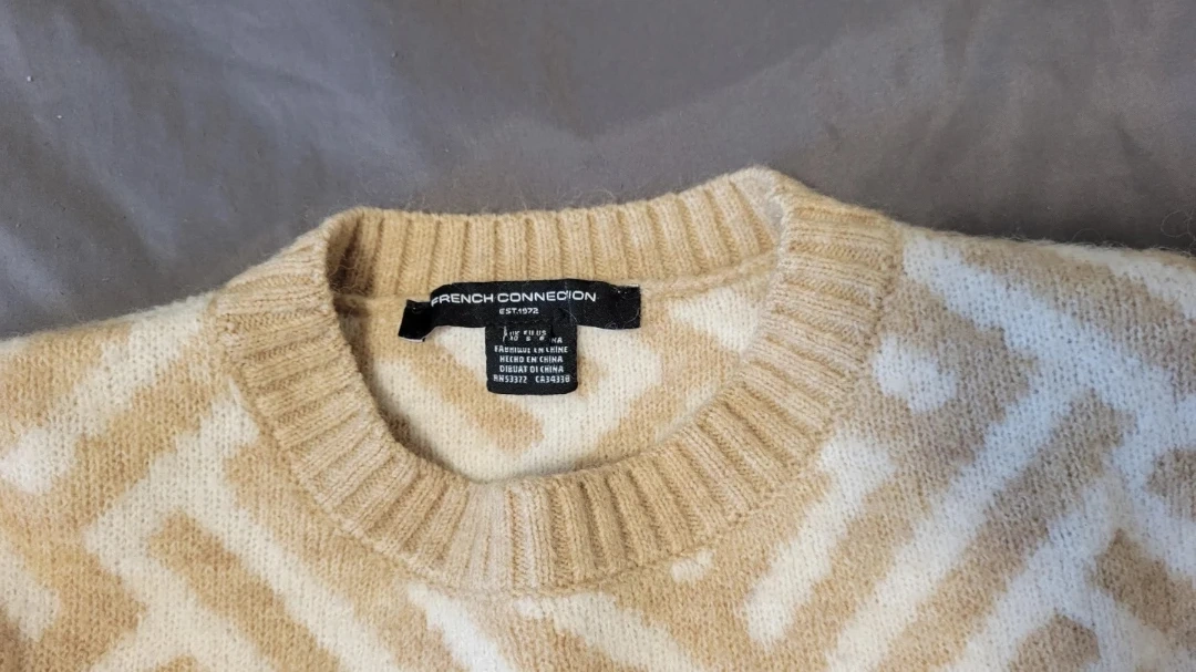 Cozy French Connection sweater with a cream and tan geometric pattern. Made from 48% acrylic, 47% polyester, and 5% elastane. Machine wash cold, inside out.