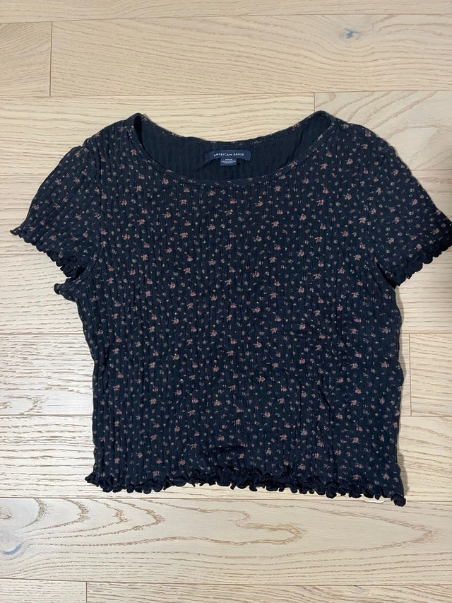 3. Black floral crop top, with crew neck & ruffle sleeves (American Eagle) ($10).