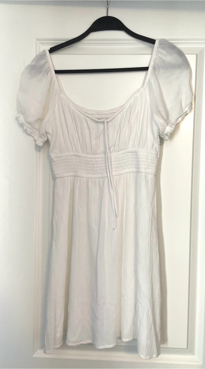 This Hollister dress is white with a smocked bodice and puff sleeves. It's a size medium and makes a great sundress for warmer weather! Spring is just around the corner. Worn once.