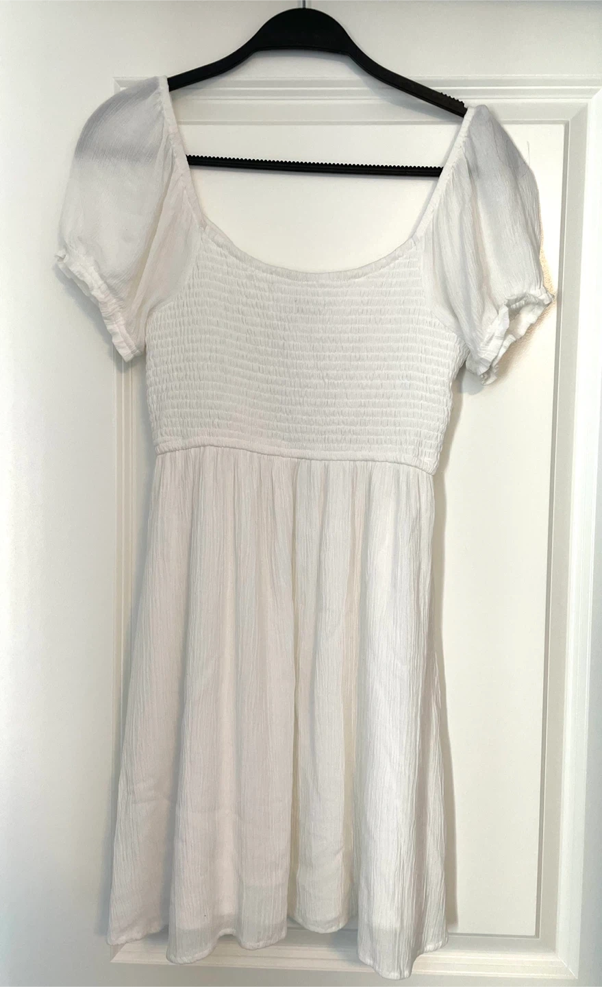 This Hollister dress is white with a smocked bodice and puff sleeves. It's a size medium and makes a great sundress for warmer weather! Spring is just around the corner. Worn once.