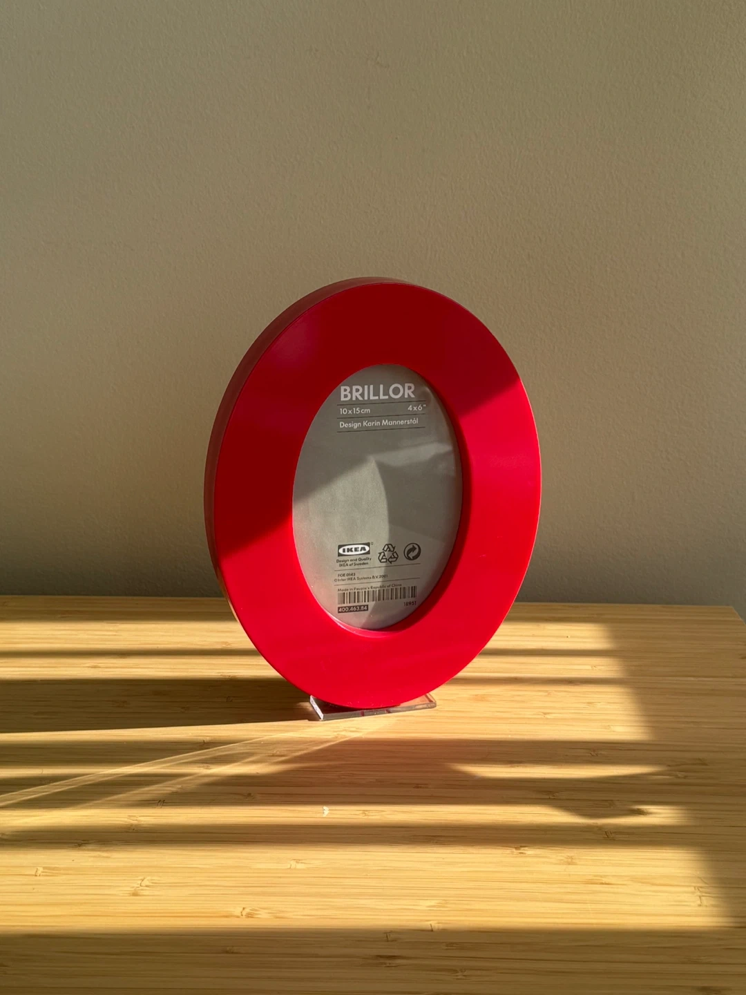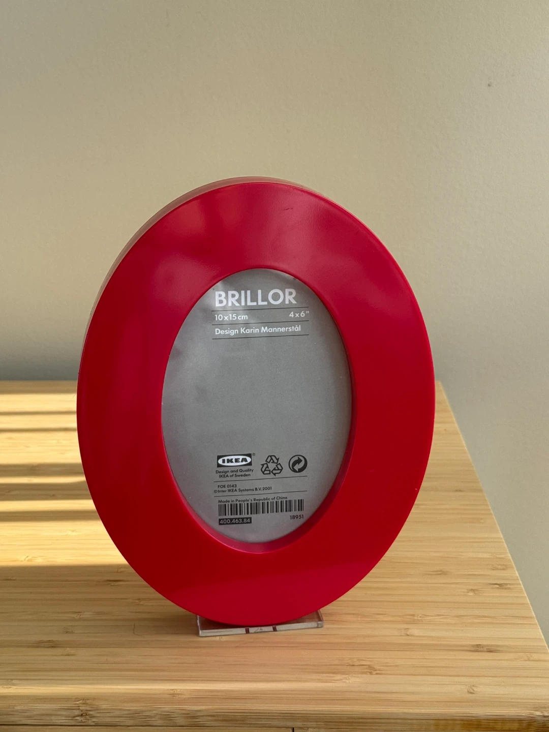 Vintage IKEA BRILLOR picture frame in red. It holds a 4x6 inch photo. The frame is made of plastic. It's designed by Karin Mannerstål.