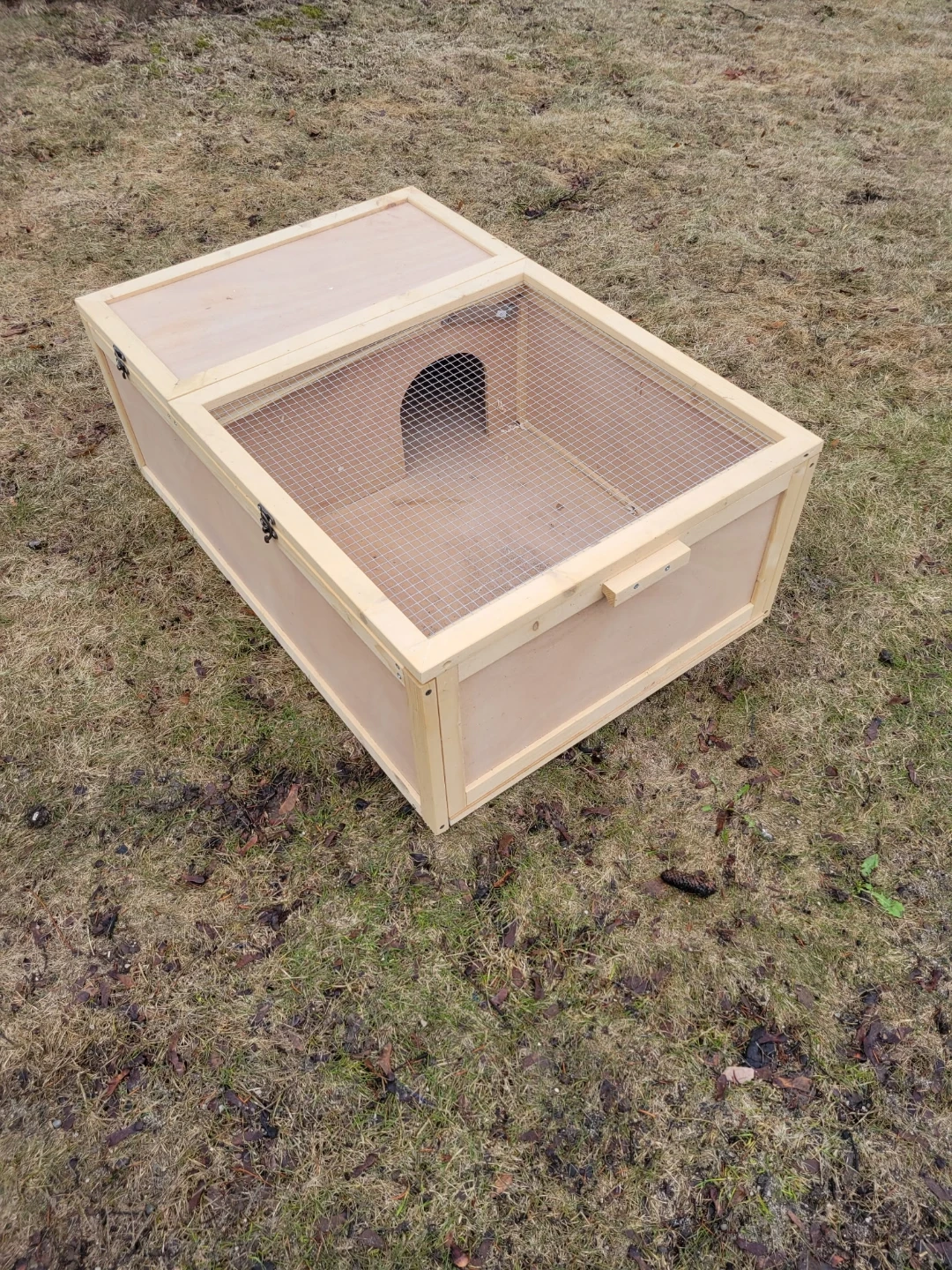 This wooden habitat features a double-room design and a mesh top for ventilation. It has wooden handles for easy transport and is simple to clean. Dimensions are 37" L x 24.8" W x 13" H.