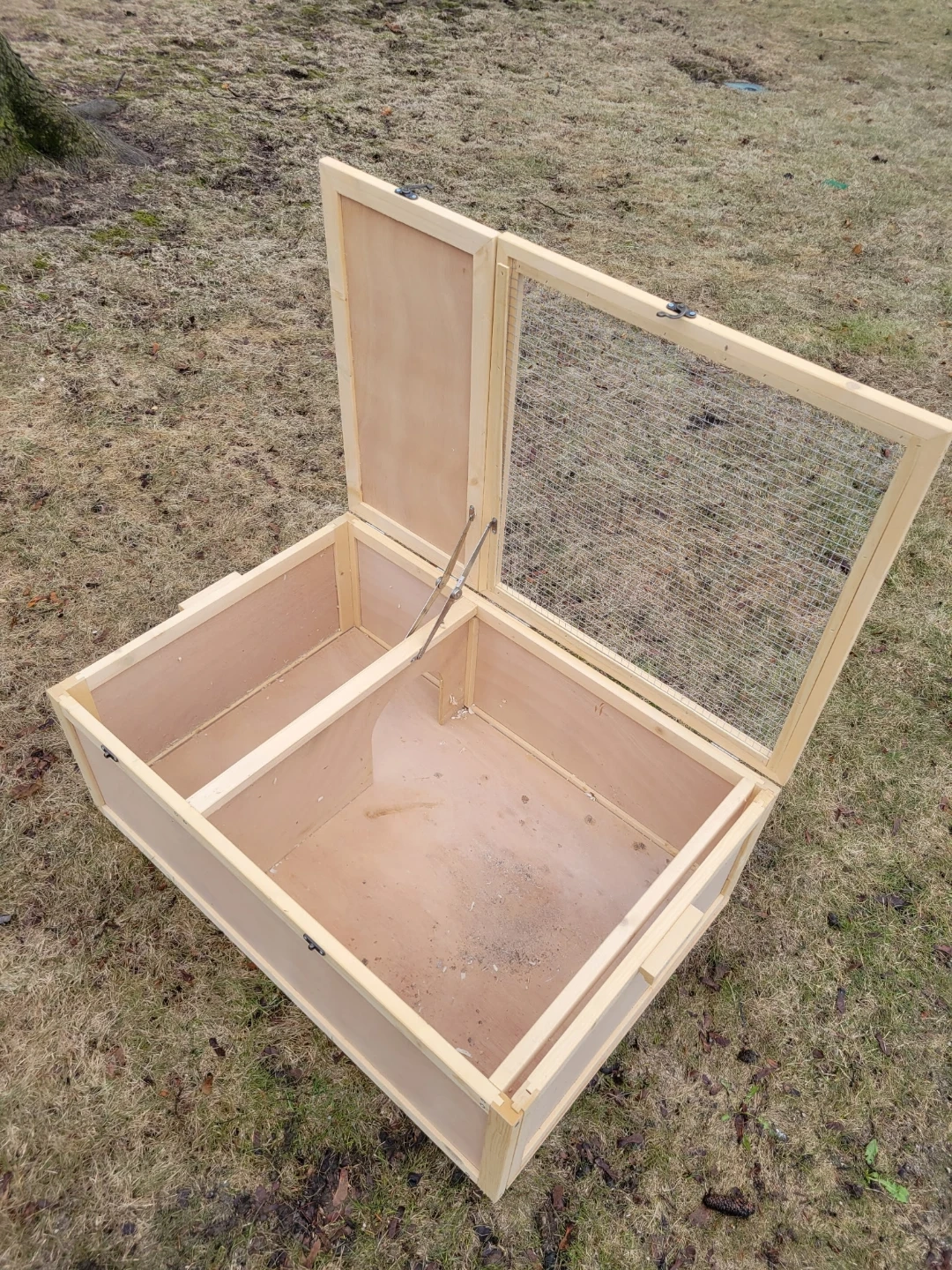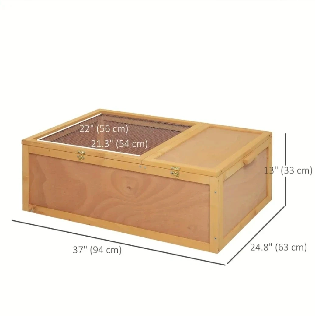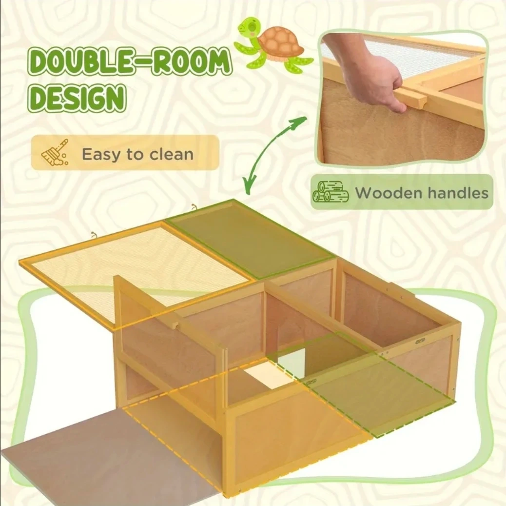 This wooden habitat features a double-room design and a mesh top for ventilation. It has wooden handles for easy transport and is simple to clean. Dimensions are 37" L x 24.8" W x 13" H.