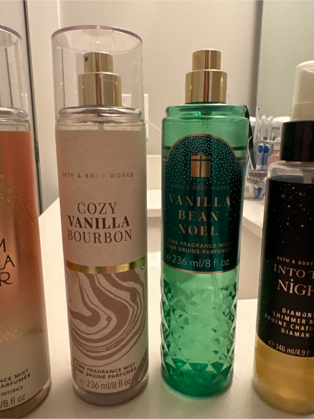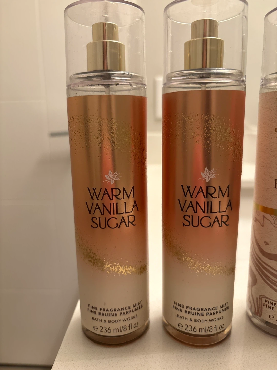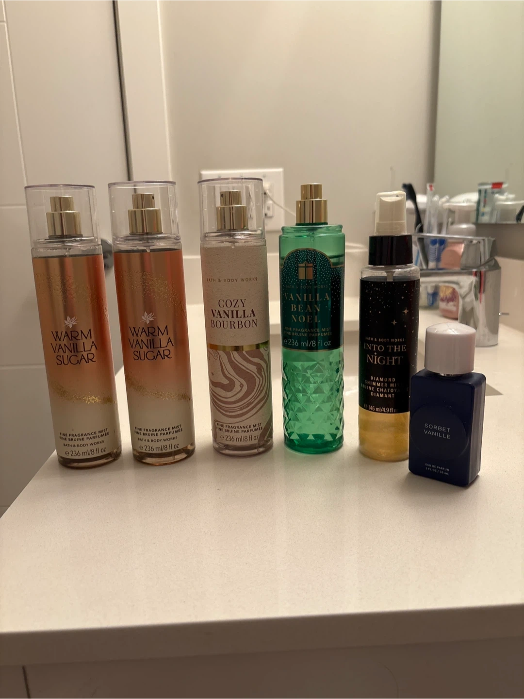 This lot includes 4 body mists and one shimmer spray that retail for 18.95 each. One warm vanilla sugar is unused, rest are all are used less than a quarter of the way.