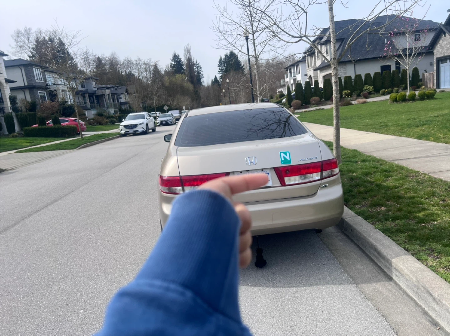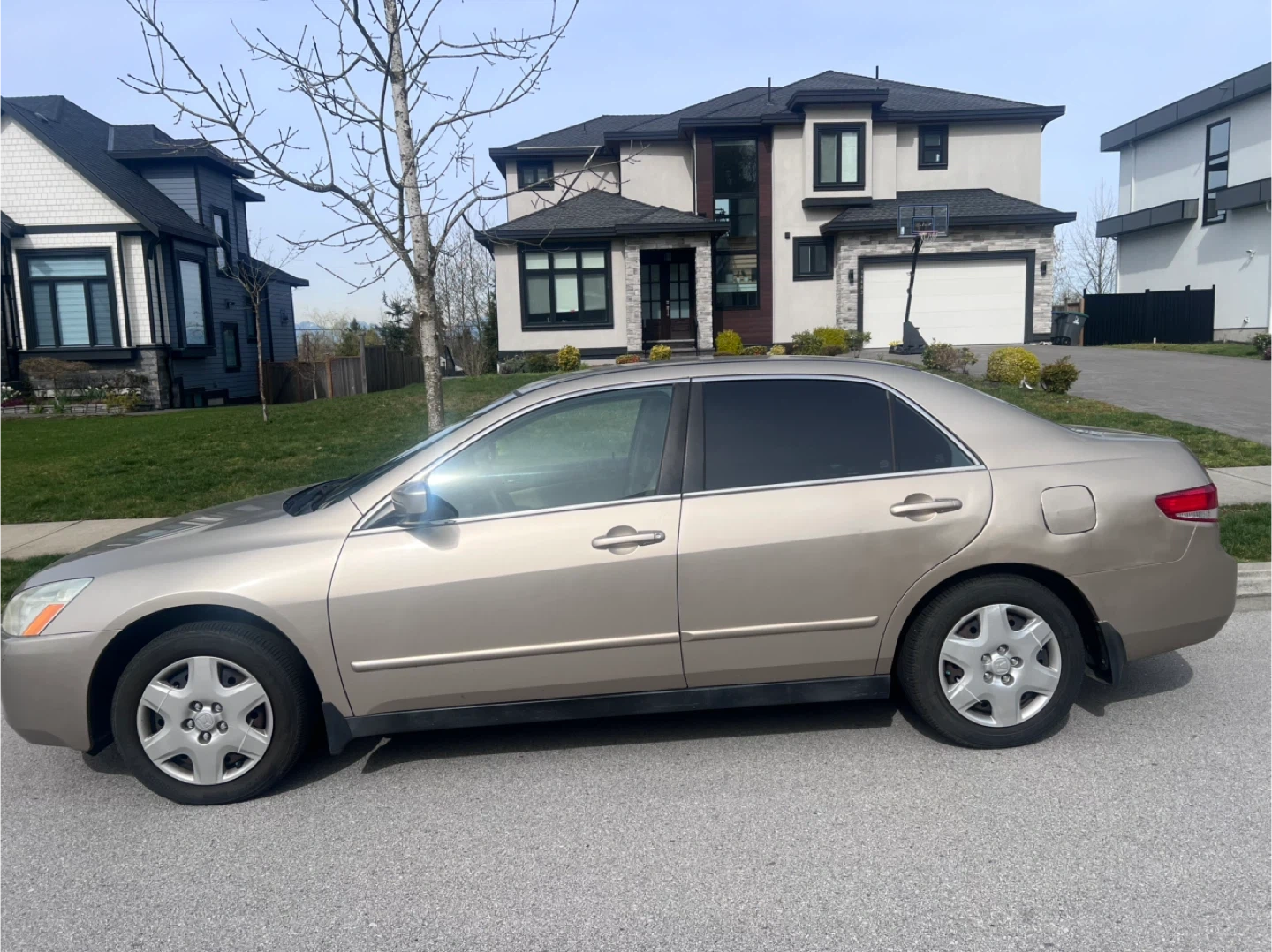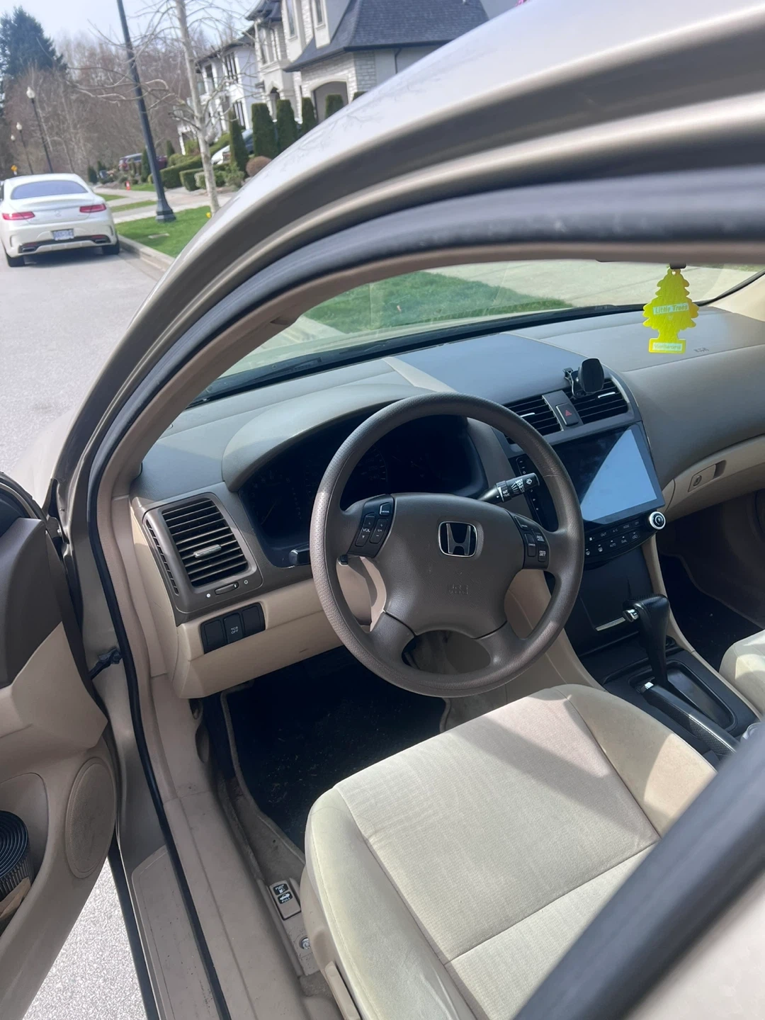 Gold Honda Accord sedan. Four doors with a spacious interior. Seats are a light tan fabric. With just 148k kms on that
