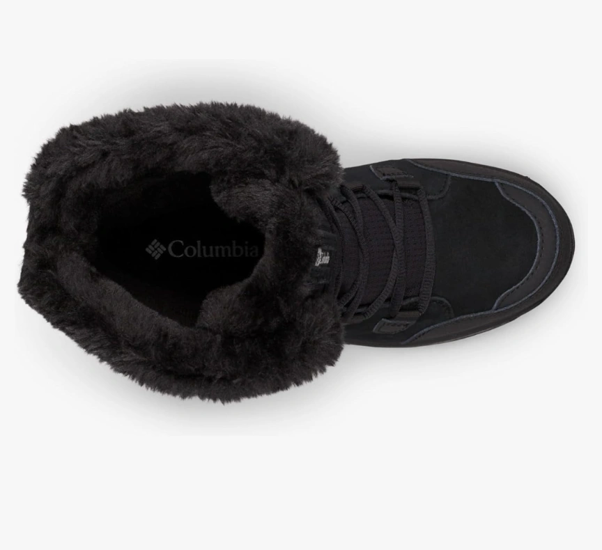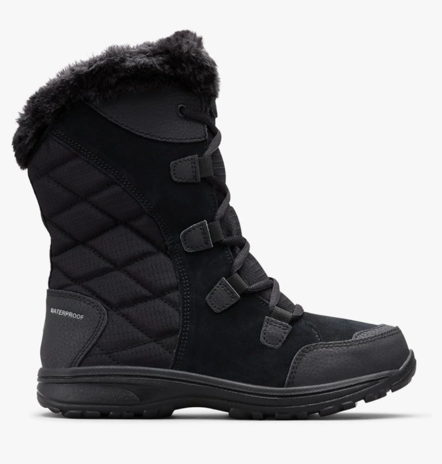 Black winter boots with fur lining and a waterproof outer layer. Lace-up design.