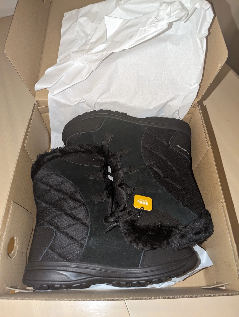 Black winter boots with fur lining and a waterproof outer layer. Lace-up design.