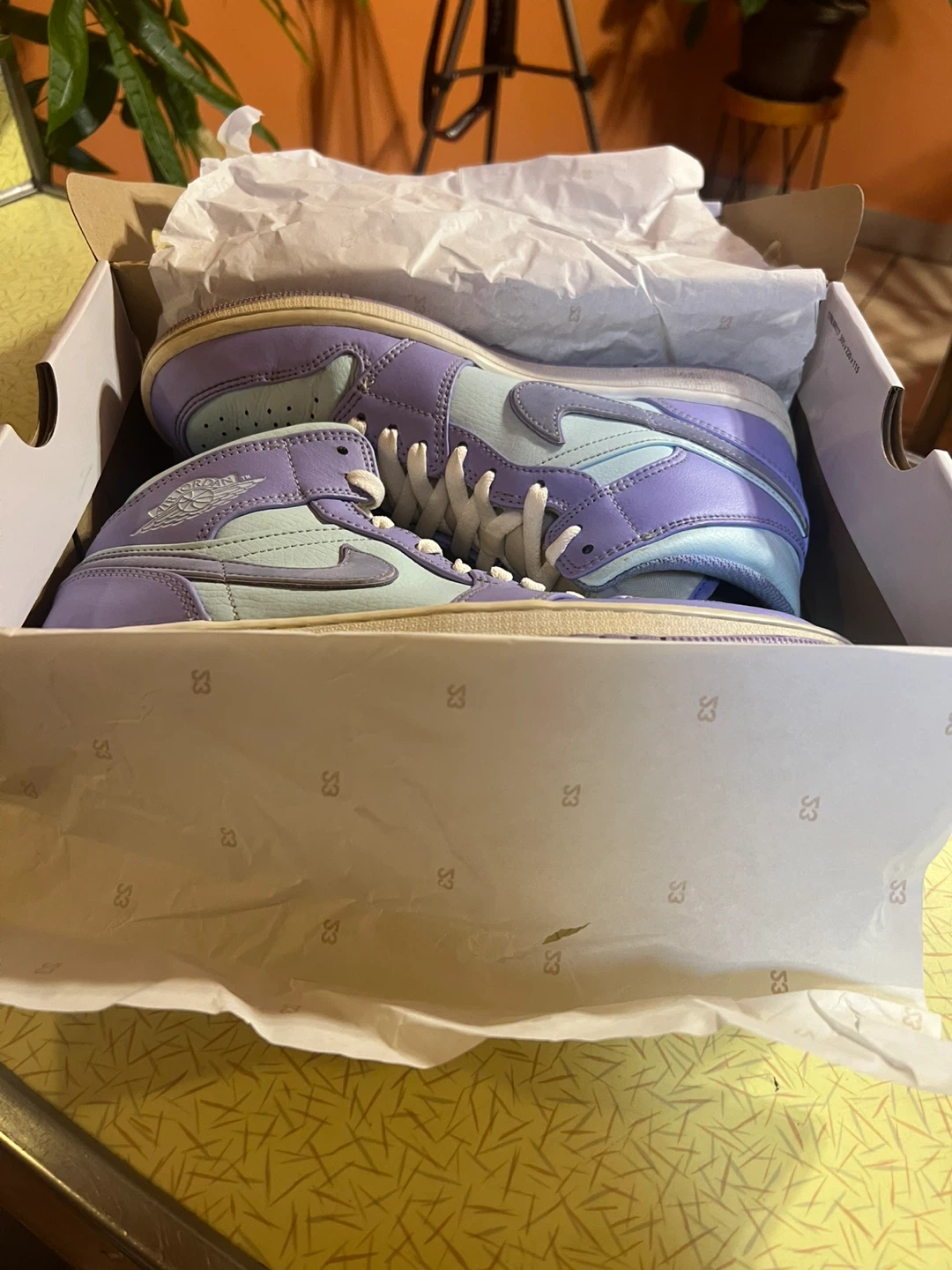 These are Air Jordan 1 High OG sneakers in the "UNC" colorway. They feature a leather and textile upper with a rubber sole. Includes original box and packaging.
