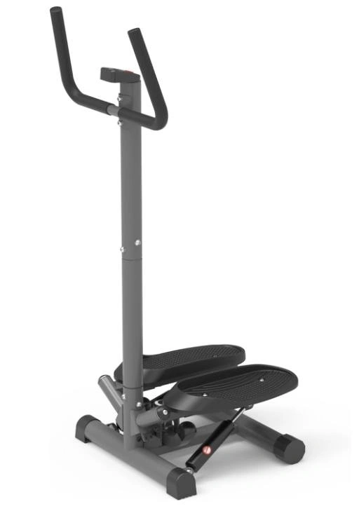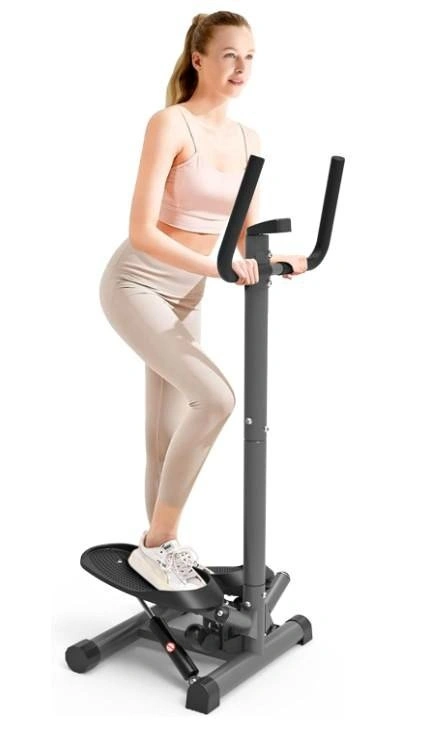Portable twist stair stepper with adjustable resistance, hand bar, and LCD monitor. Black.
