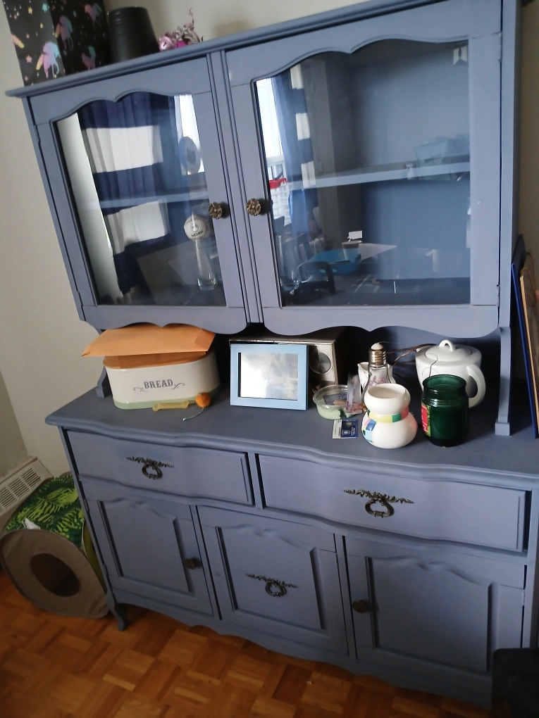 Selling a blue painted hutch. It has a vintage look and would be great for storage or display. There are drawers and cabinets below for closed storage and glass cabinets up top. PICK UP ONLY.