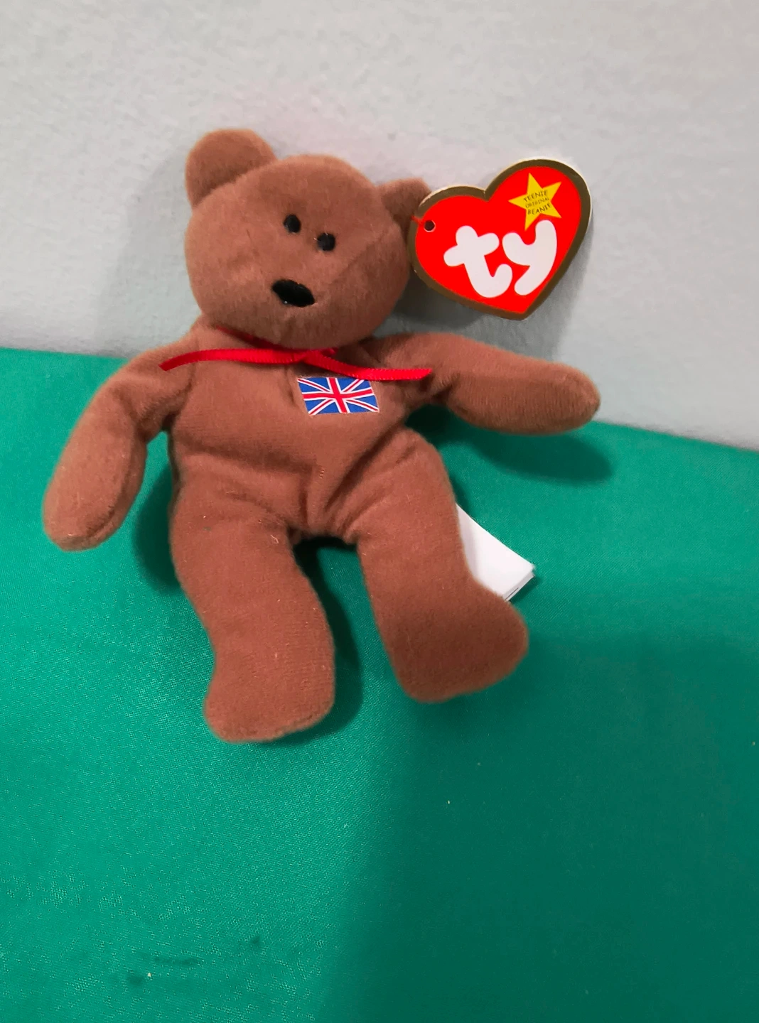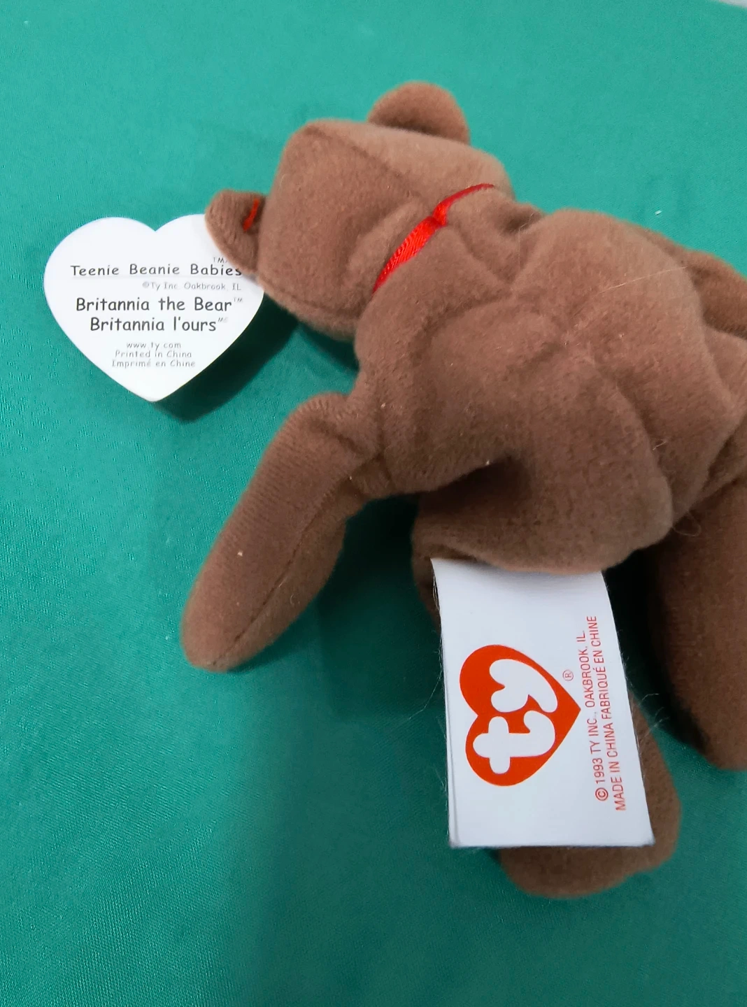 This is a "Britannia the Bear" Teenie Beanie Baby. It's a small plush toy with a red ribbon and a UK flag patch. The tag has the Ty logo and copyright info.