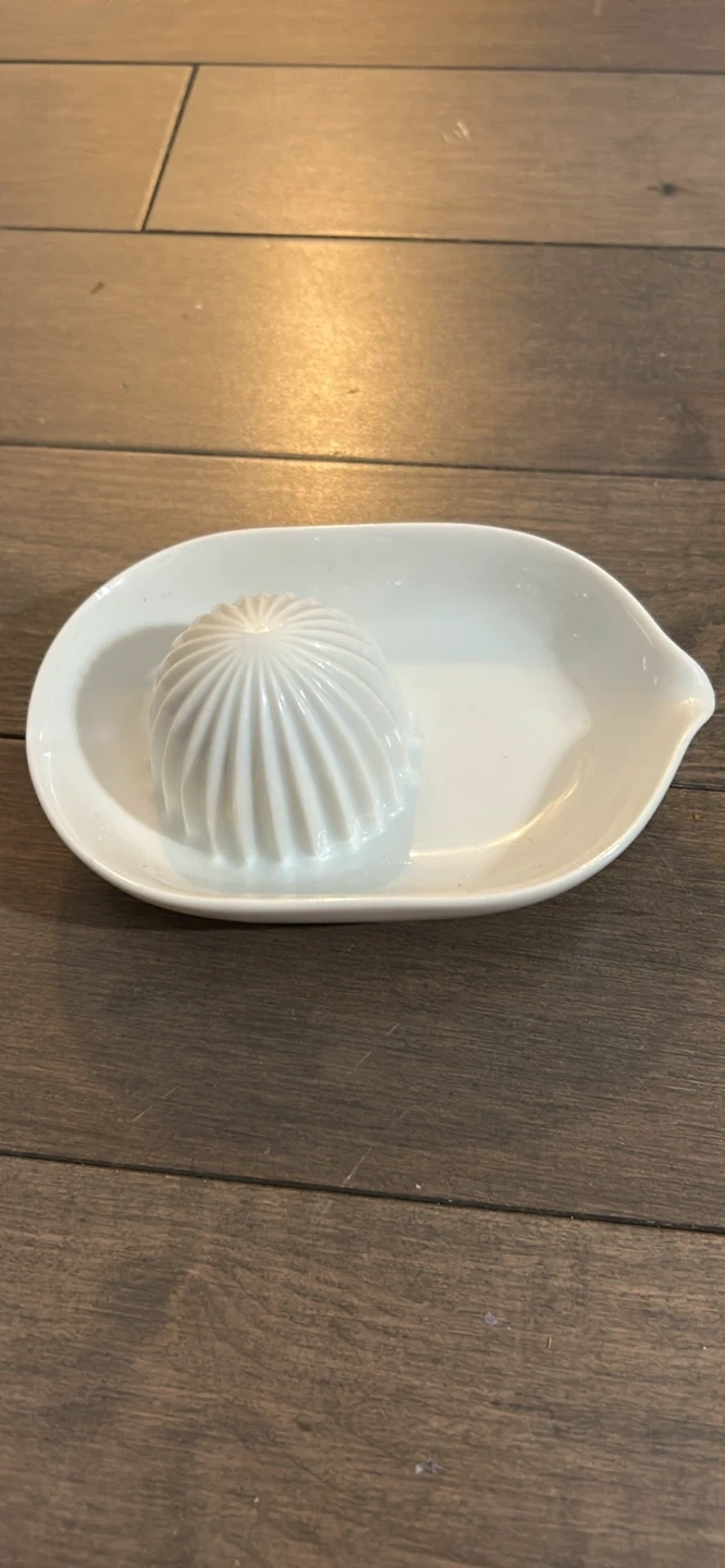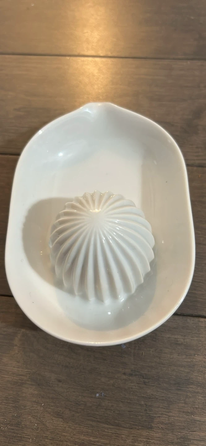 Selling a white ceramic lemon juicer. It's in great condition and ready for your kitchen! Perfect for squeezing fresh lemons for lemonade, cooking, or cocktails