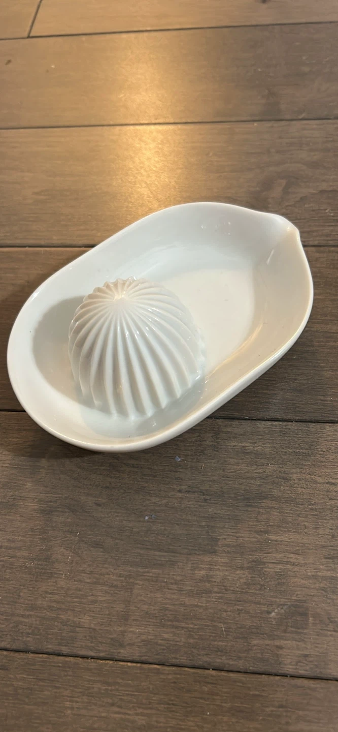 Selling a white ceramic lemon juicer. It's in great condition and ready for your kitchen! Perfect for squeezing fresh lemons for lemonade, cooking, or cocktails