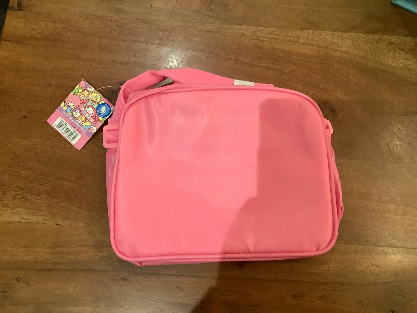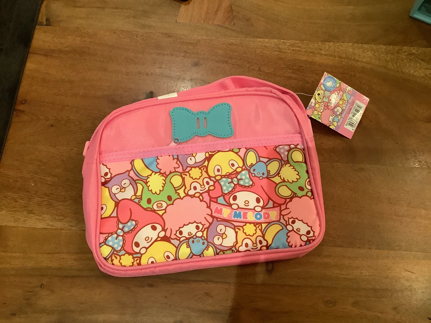 This pink crossbody bag features a colourful My Melody graphic print. It has a top zipper closure and an adjustable shoulder strap. Perfect for kids to carry their essentials! Has 2 pockets and includes a free sticker!